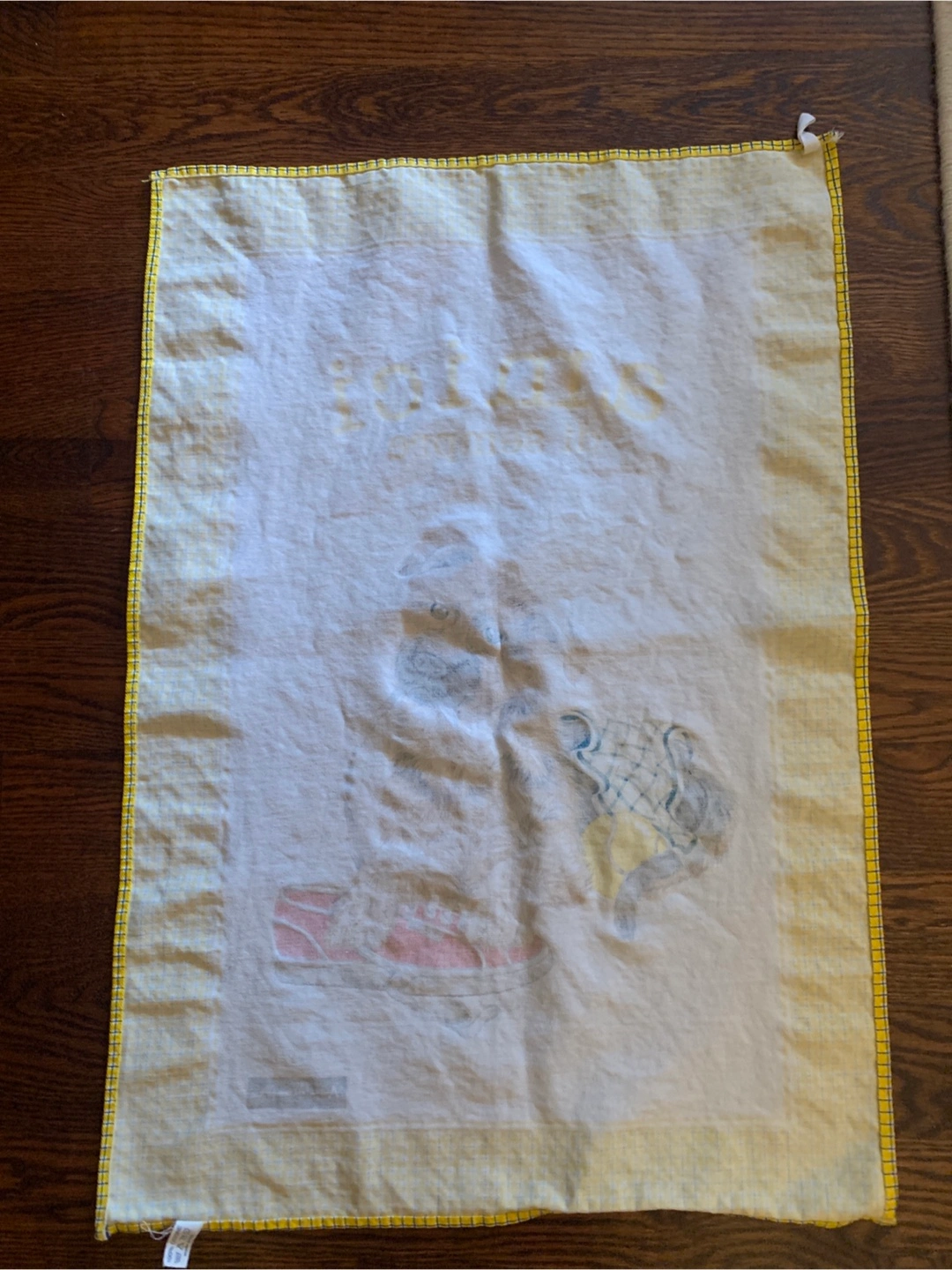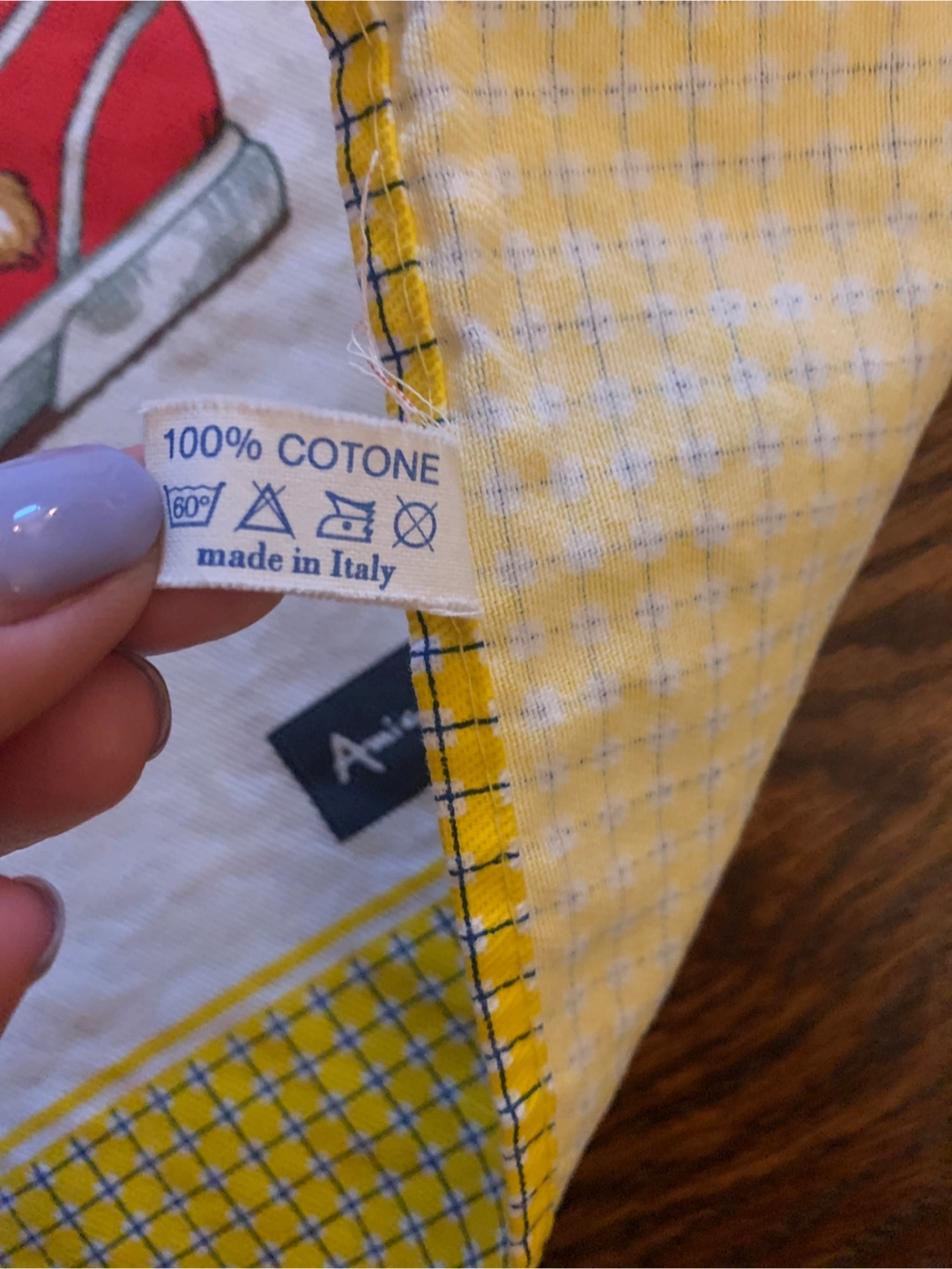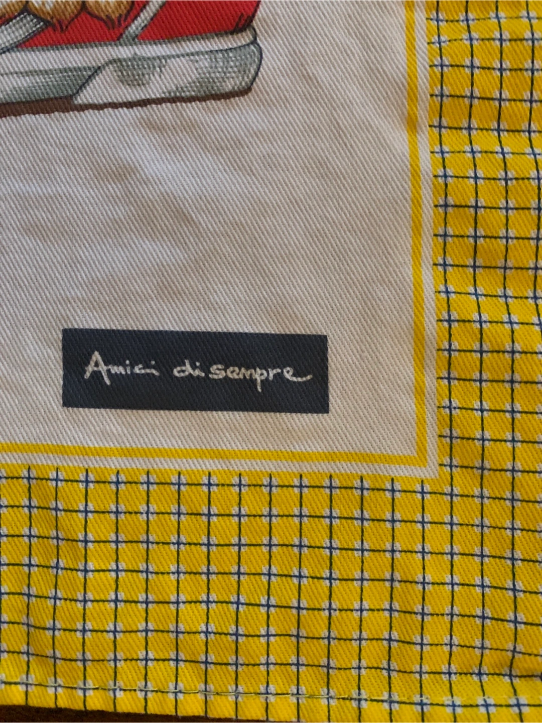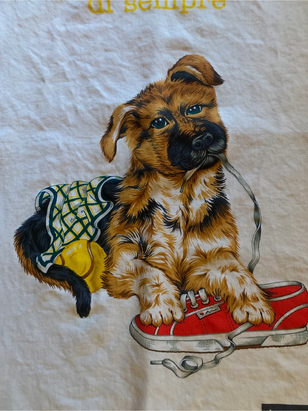 Here's a cute Amici di Sempre (Friends of All Time) dish towel! Definitely a lovely kitchen accessory for dog lovers! It's made of 100% cotton and features a charming puppy design with yellow checkered trim. Features a hook loop in the back for hanging to dry. Made in Italy, and will be a lovely addition to any kitchen! Cash only please.