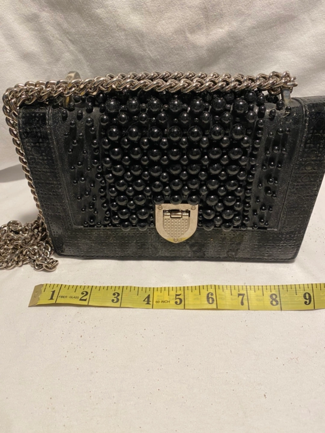 Selling a stylish black beaded purse with a silver-tone chain! It's in good condition and perfect for adding a unique touch to any outfit. The purse measures approximately 9 inches in length and 5 inches in height.