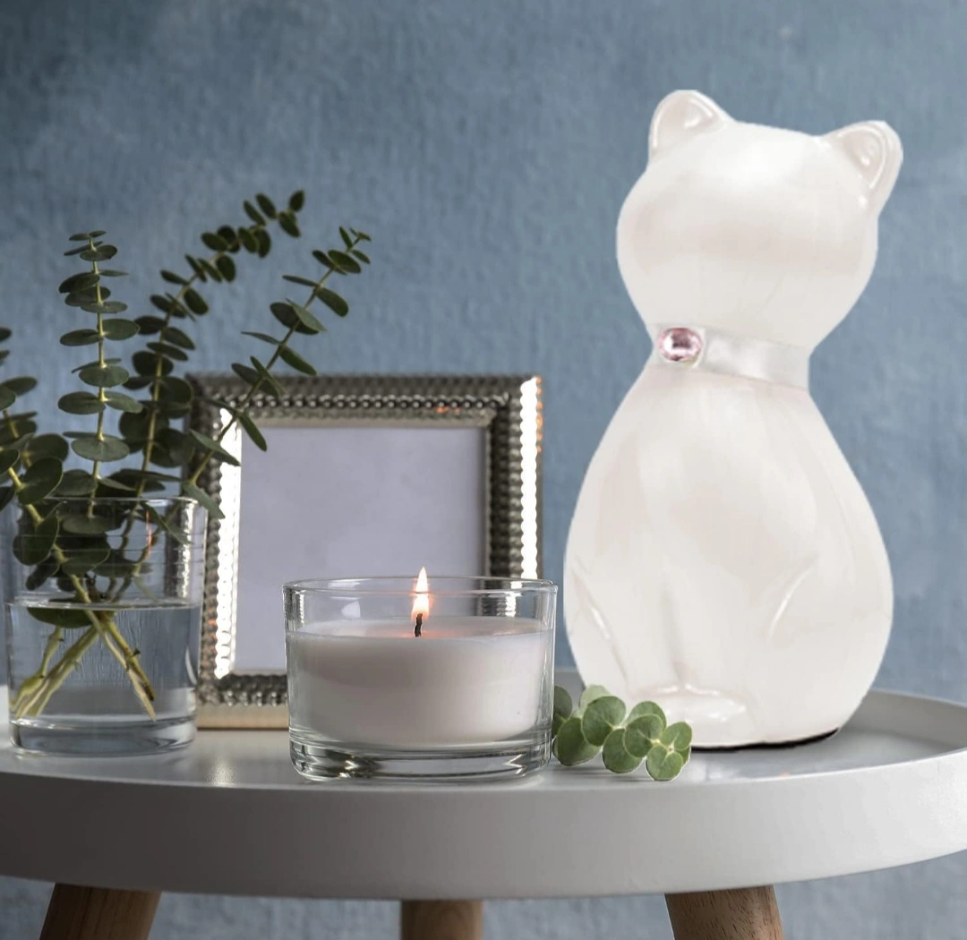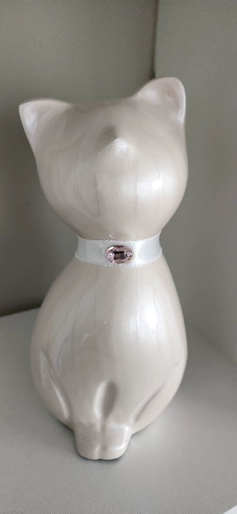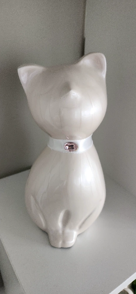 Cherish the memory of your late cat with this urn for ashes. This lovely container comes in a charming cat shape designed to help you pay tribute to your pet. It has an elegant, smooth finish, a crystal pink accent, and a hand-applied pearlescent white enamel giving it a beautiful prismatic effect. Made using sturdy and durable metal alloy so it won't crack, break, or chip easily. Measures 8.25" x 4.25" and can hold up to 42 cubic inches of ash (1 lb of your cat's living weight is approximately 1 cubic inch of ash). Light and portable so can be taken anywhere you go. Brand new. Never used.