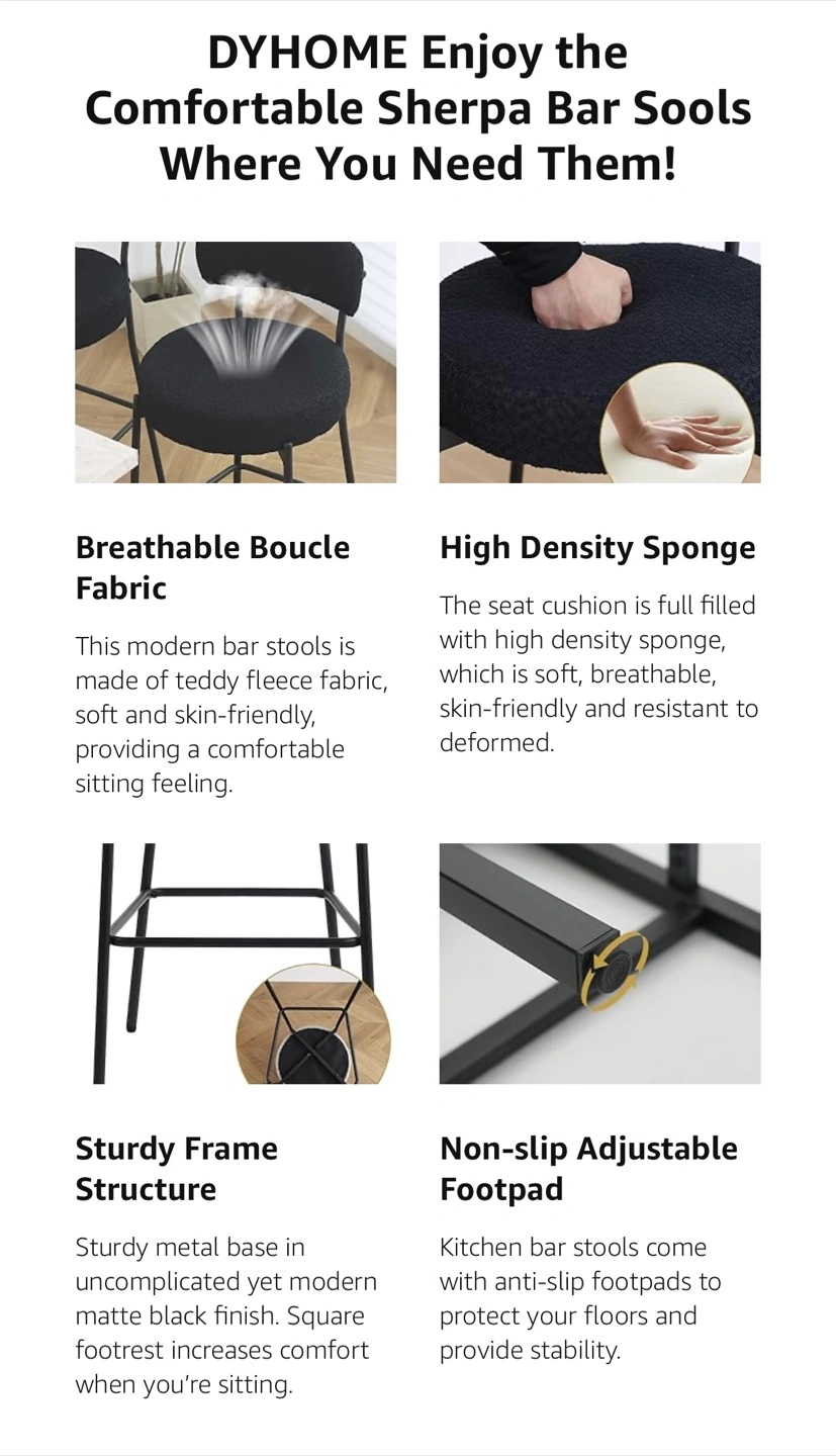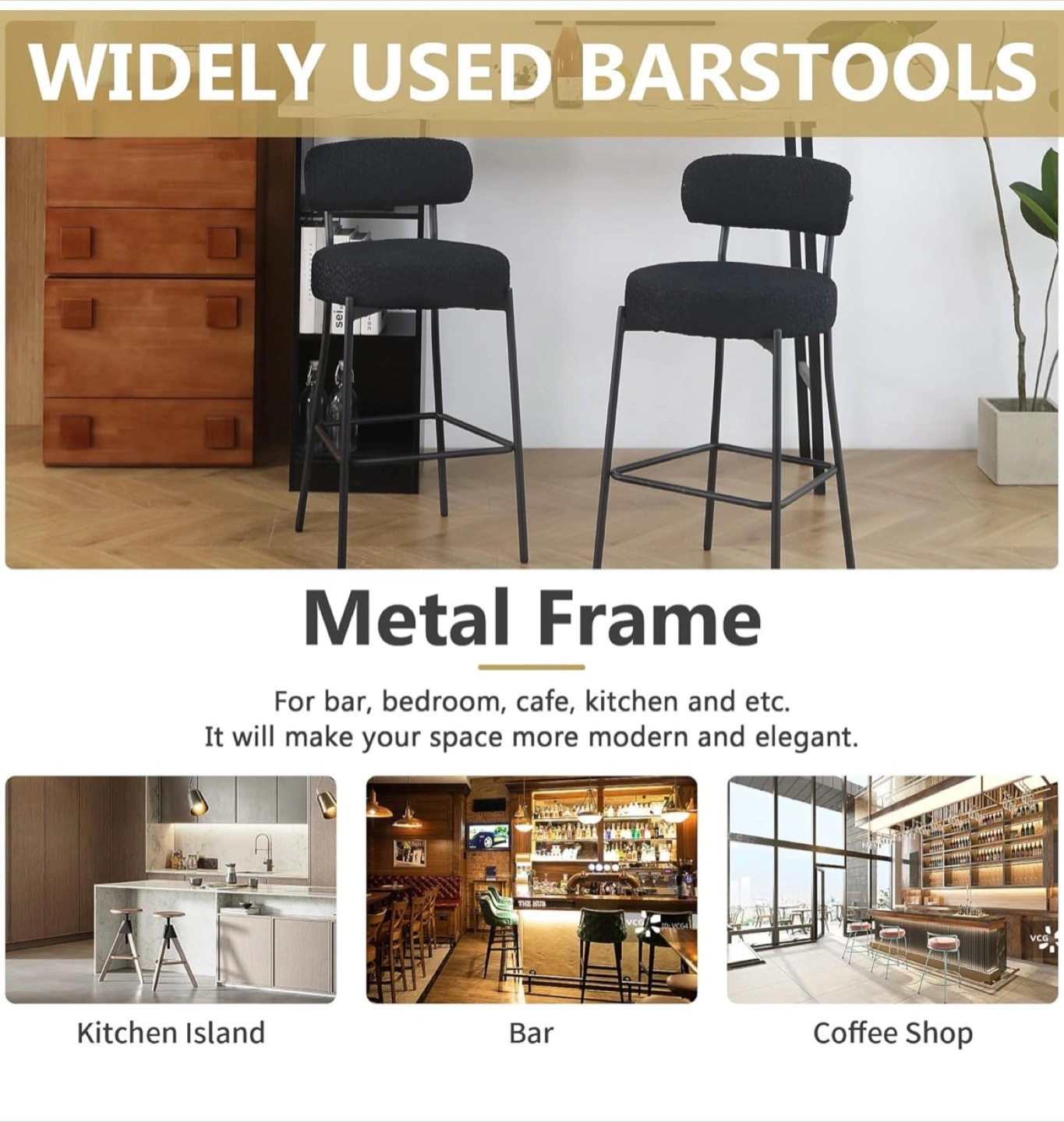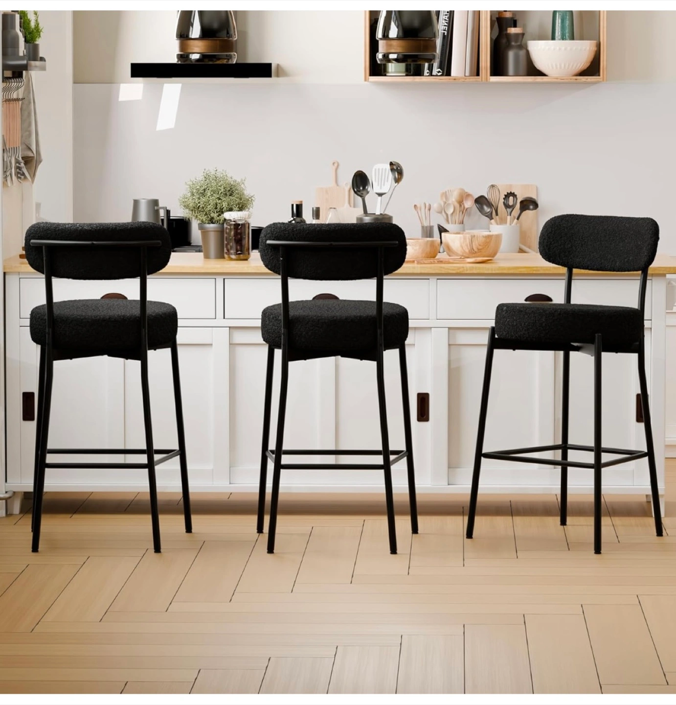 DYHOME Black Boucle Bar Stools Set of 3, 27” Counter Height. Black Metal Frame. New! Never Used, Assembled to Sell. $160 for set of 3. Price is firm. Reg. Price $360 +HST