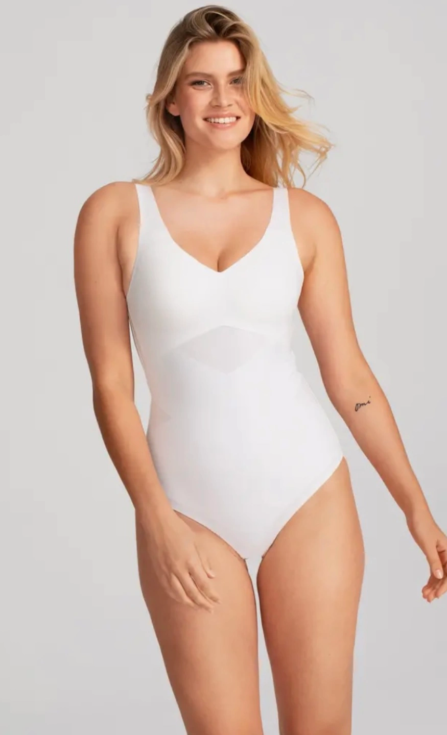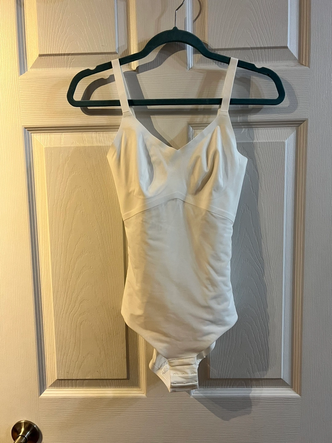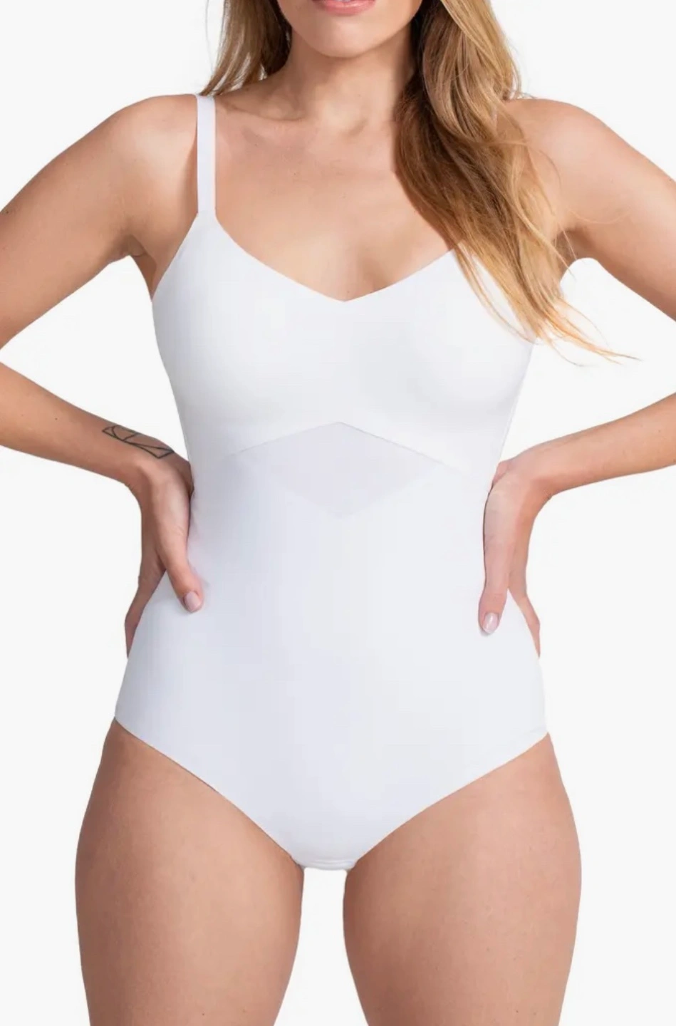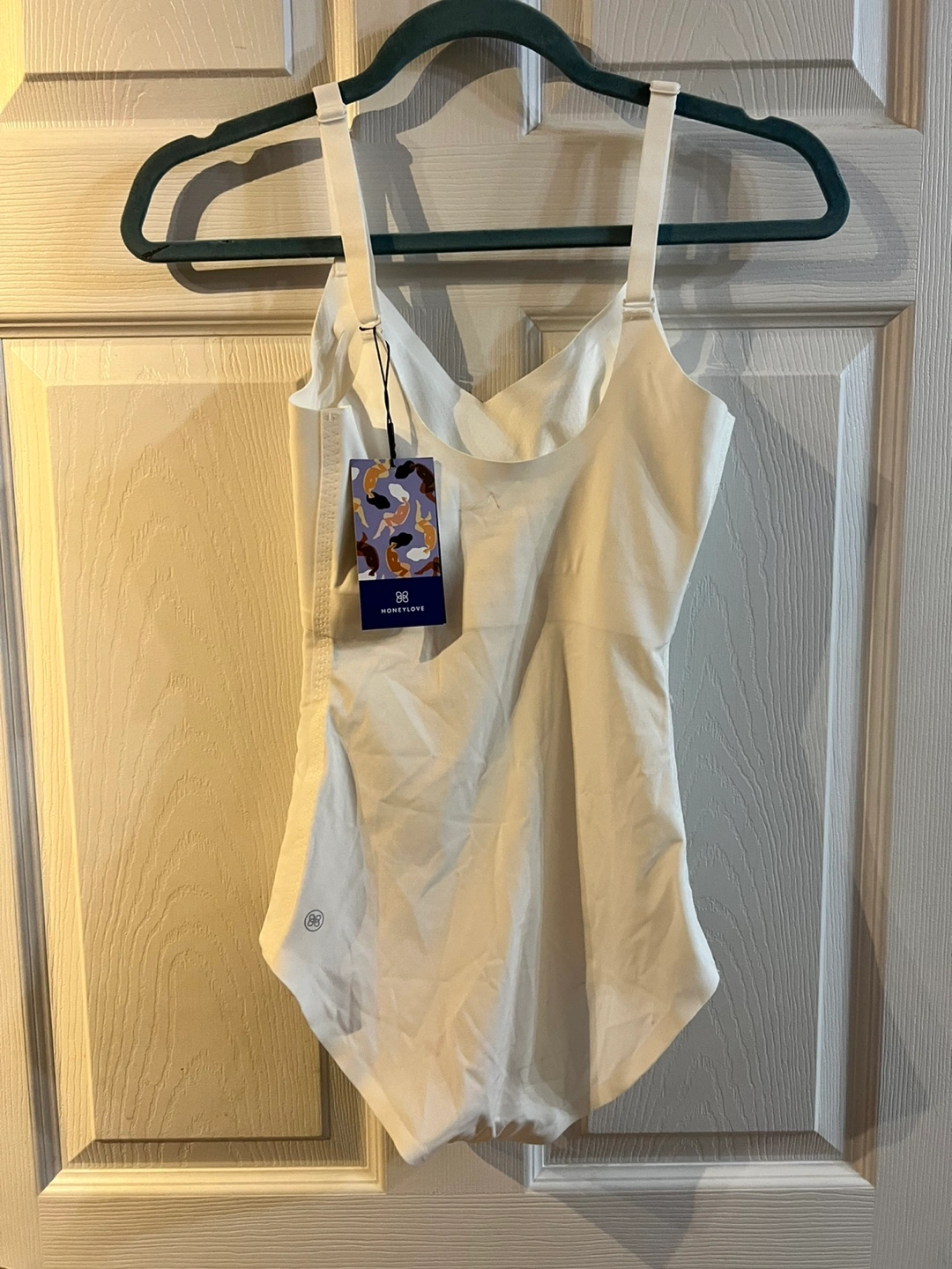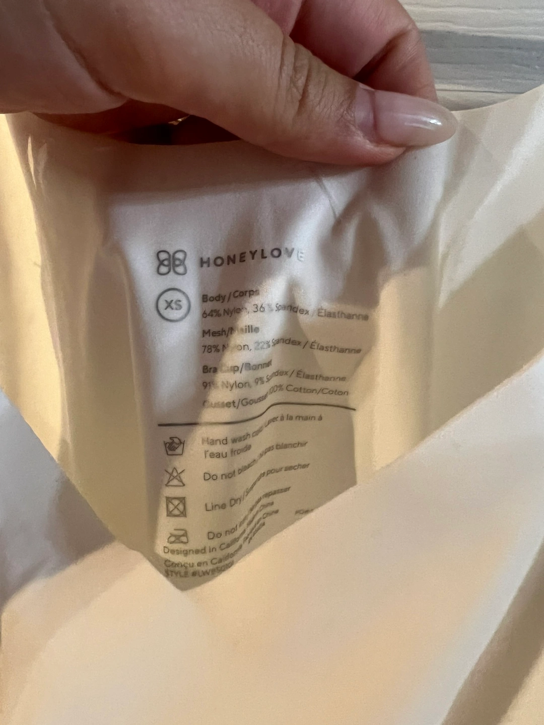 Here's a Honeylove Sculptwear bodysuit in size XS! It's made with 64% nylon and 36% spandex for the body, and the mesh is 78% nylon and 22% spandex. The bra cup is 91% nylon and 9% cotton. Perfect for a smooth and sculpted look!