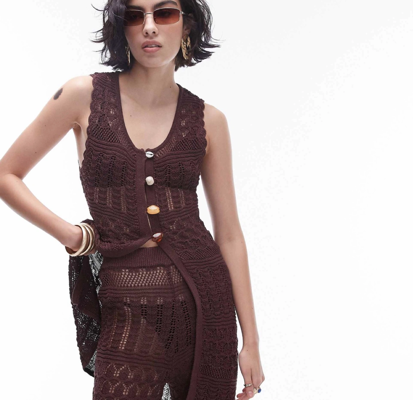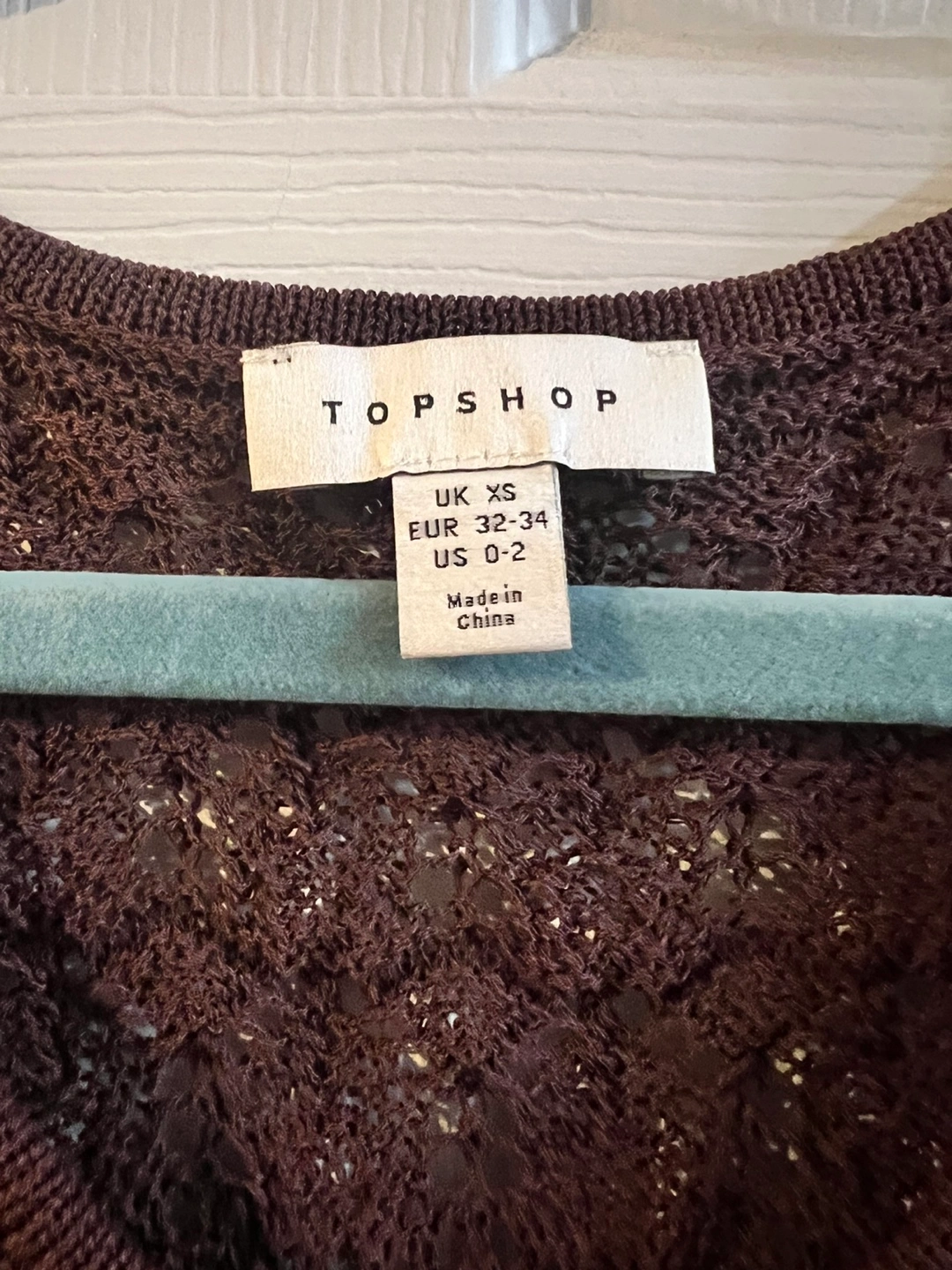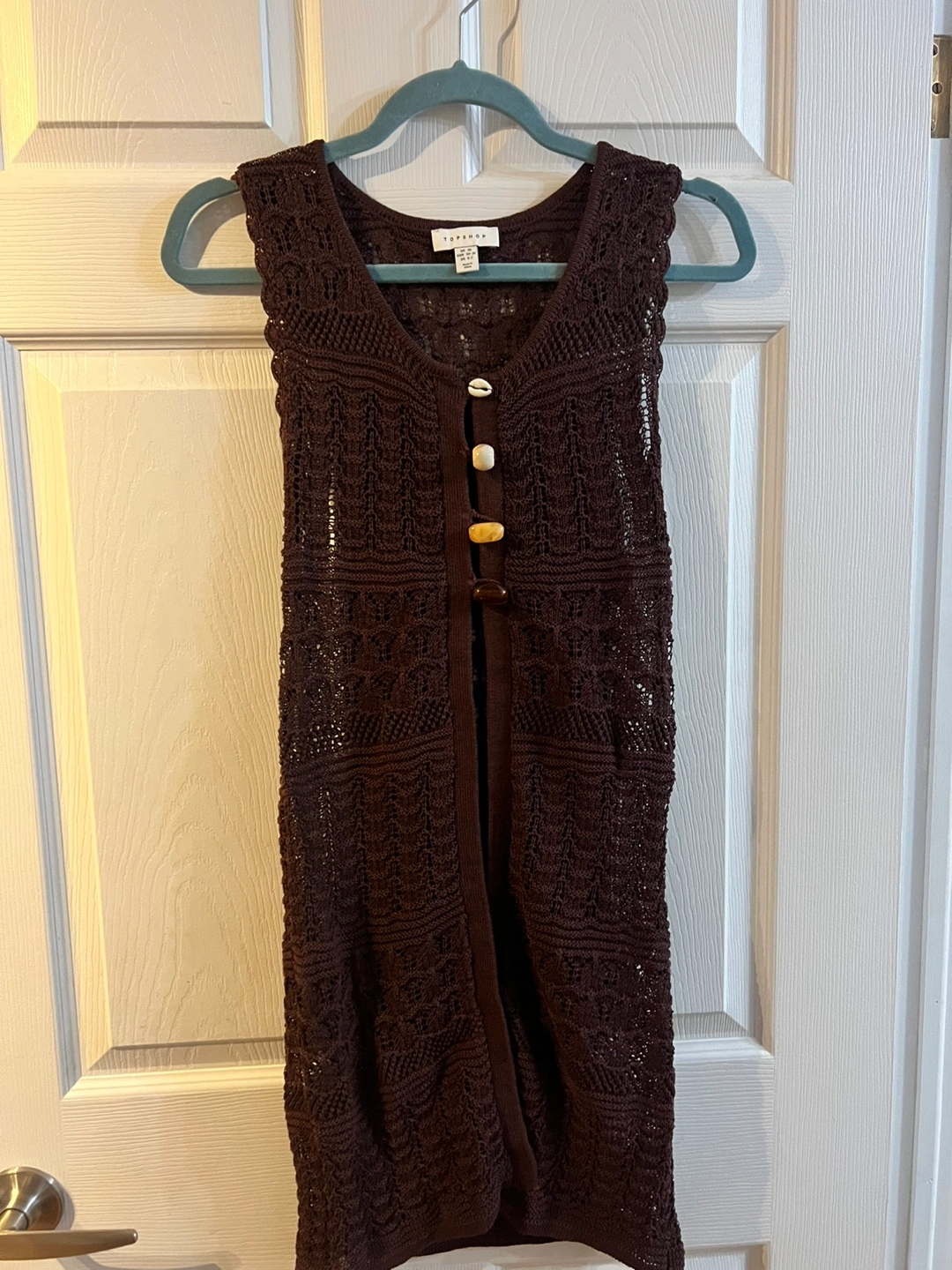 Selling a cute Topshop crochet vest in a lovely brown colour! It's a size XS (US 0-2, UK 32-34). The vest features unique shell-like buttons down the front, adding a touch of bohemian style to any outfit