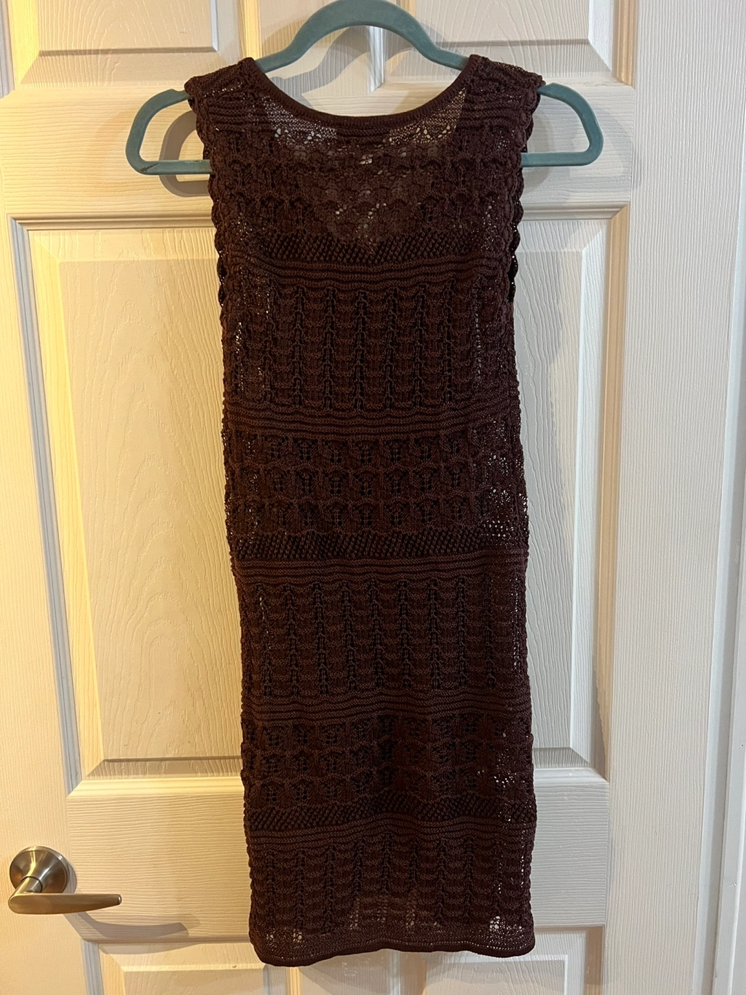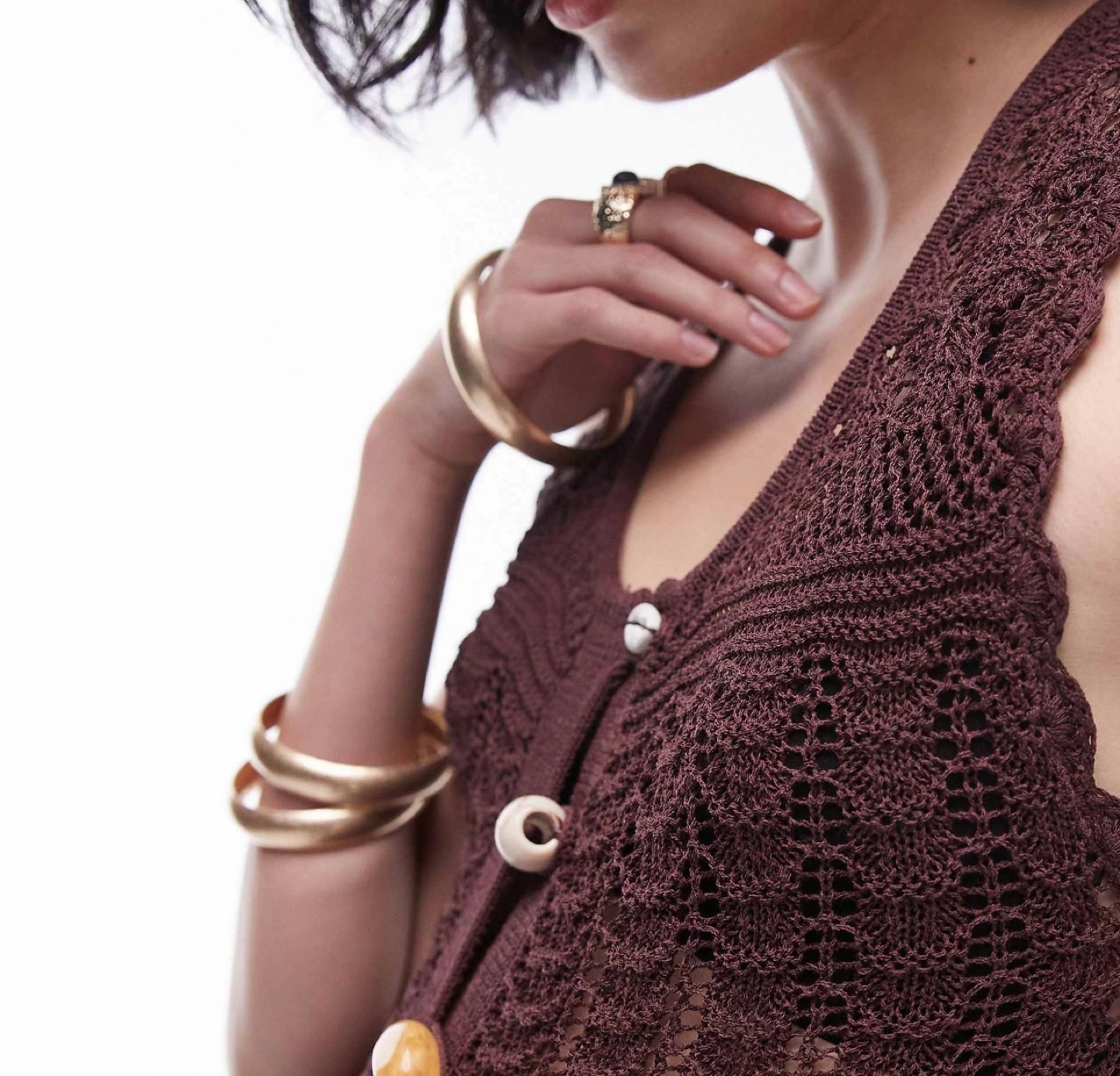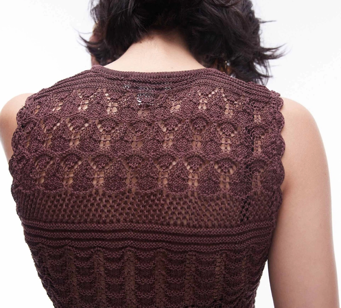 Selling a cute Topshop crochet vest in a lovely brown colour! It's a size XS (US 0-2, UK 32-34). The vest features unique shell-like buttons down the front, adding a touch of bohemian style to any outfit