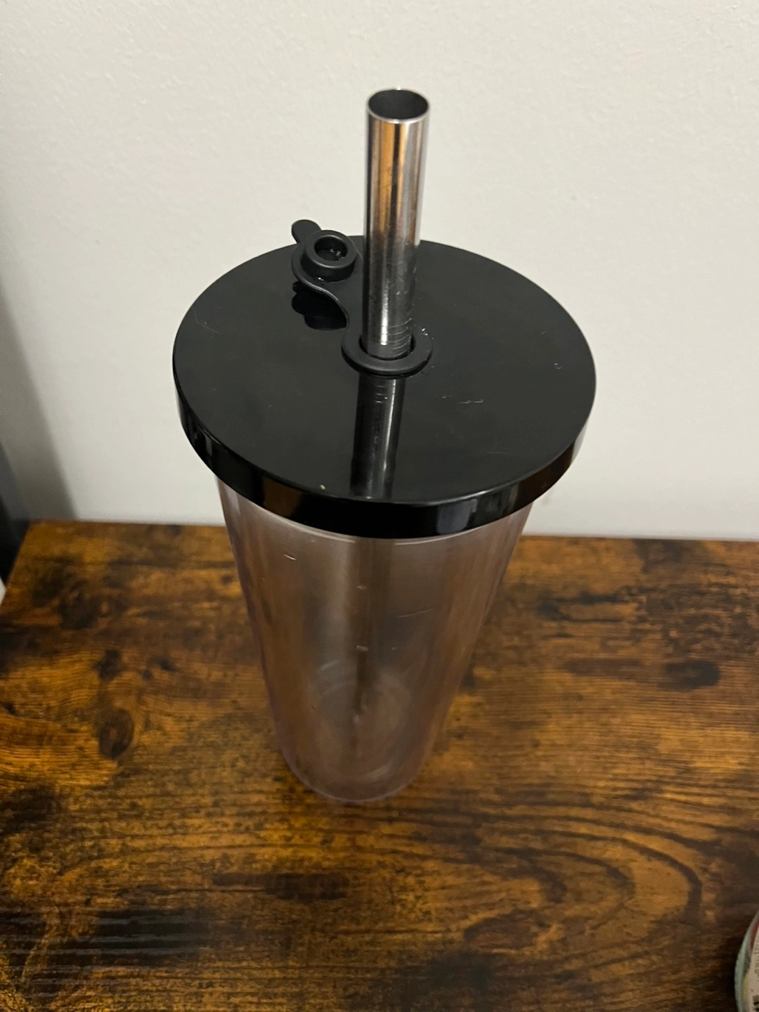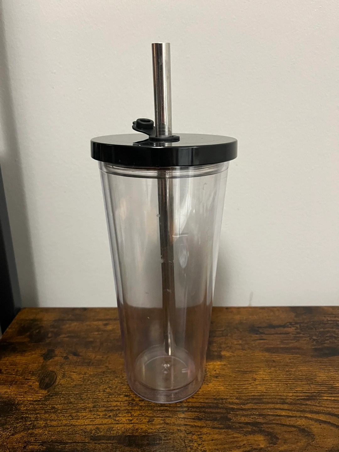 Selling a clear tumbler with a black lid and a stainless steel wide straw. It's in great shape and ready for your favourite drinks!