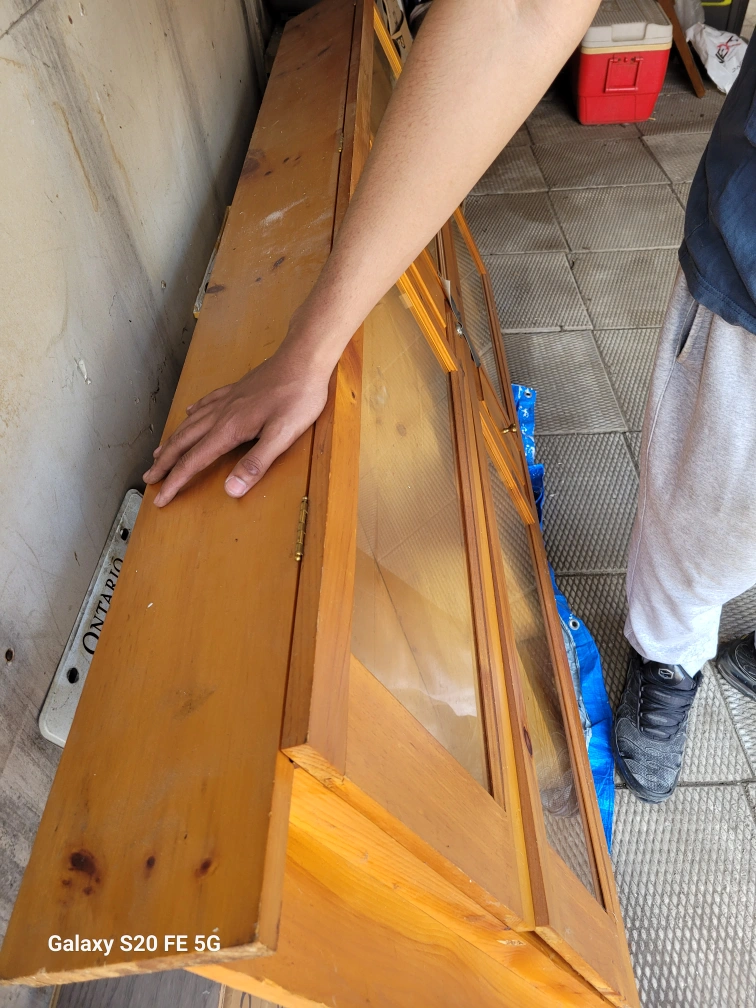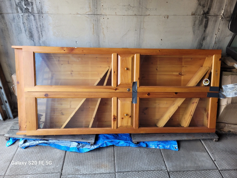 Selling a wood-framed glass door. It's a beautiful door that could be used to add some character to your home or cottage. It's in good condition and ready for a new home!