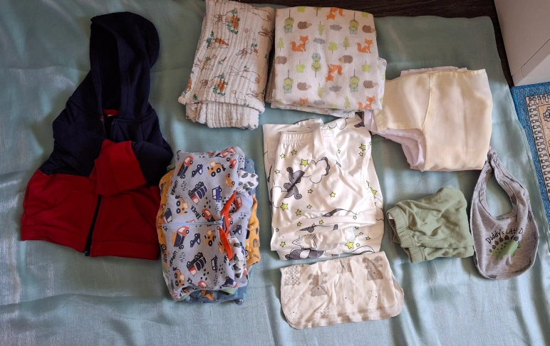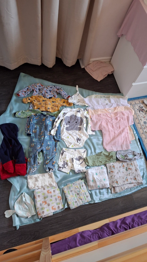 Selling gently used mixed bundle of baby clothing! Includes a variety of items such as onesies, pants, bibs, and a jacket. All in good condition and ready for a new home. Perfect for newborns to about 6 months old From a Smoke Free home and pet free home.