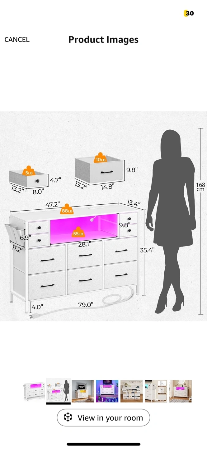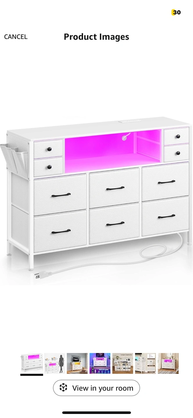 Rolanstar Dresser with Power Outlets and LED Lights 10 Drawers Dresser with Side Pocket, Fabric Chest of Drawers with PU Finish,m TV Stand with Wood Top for up to 55inch TV White Open box Retails for $199 + tax Pickup at Jane & Bloor