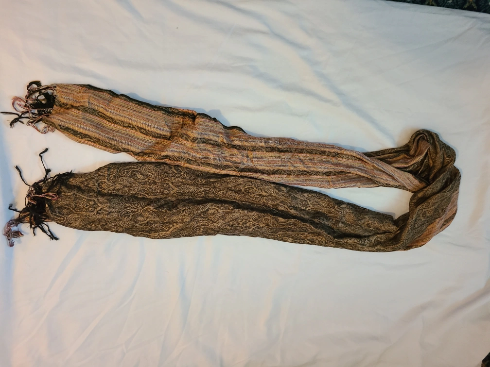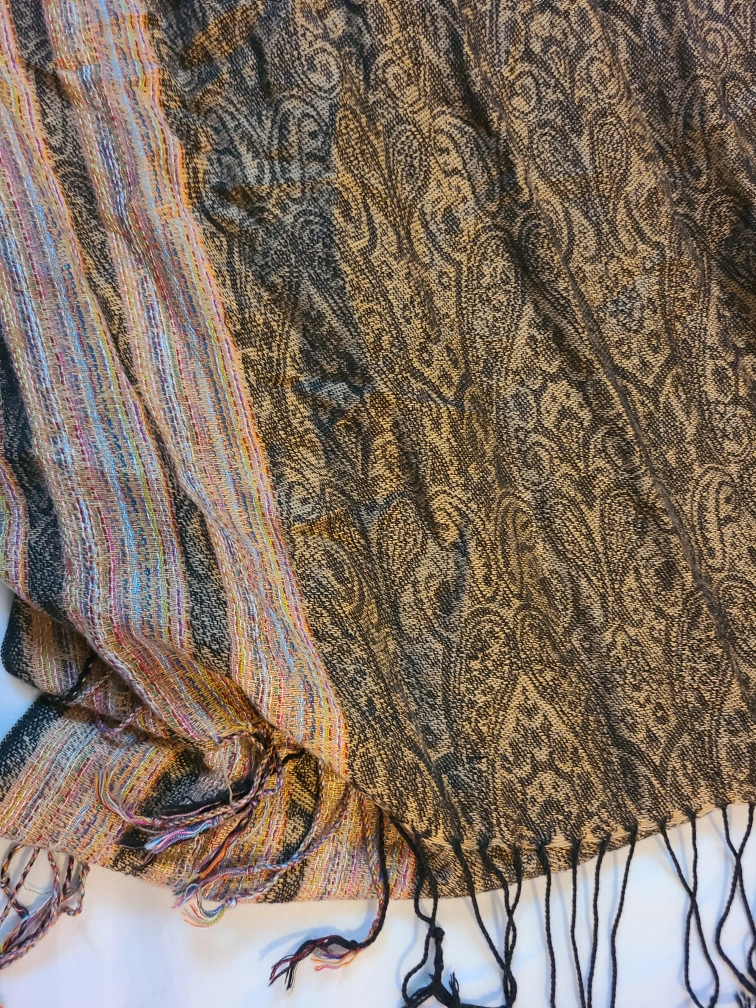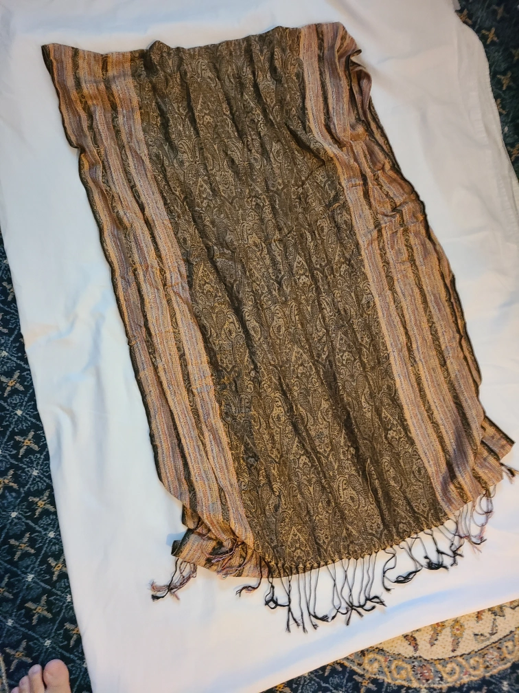 A lovely scarf featuring a paisley pattern and fringe details! The colours are a mix of brown, beige, and a touch of multicoloured stripes on one side. It's in great condition and ready to add a stylish touch to your outfit. Wool pashmina scarf From a pet-free, smoke-free home Porch pickup near Bathurst station
