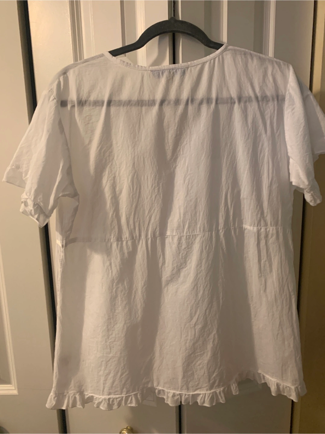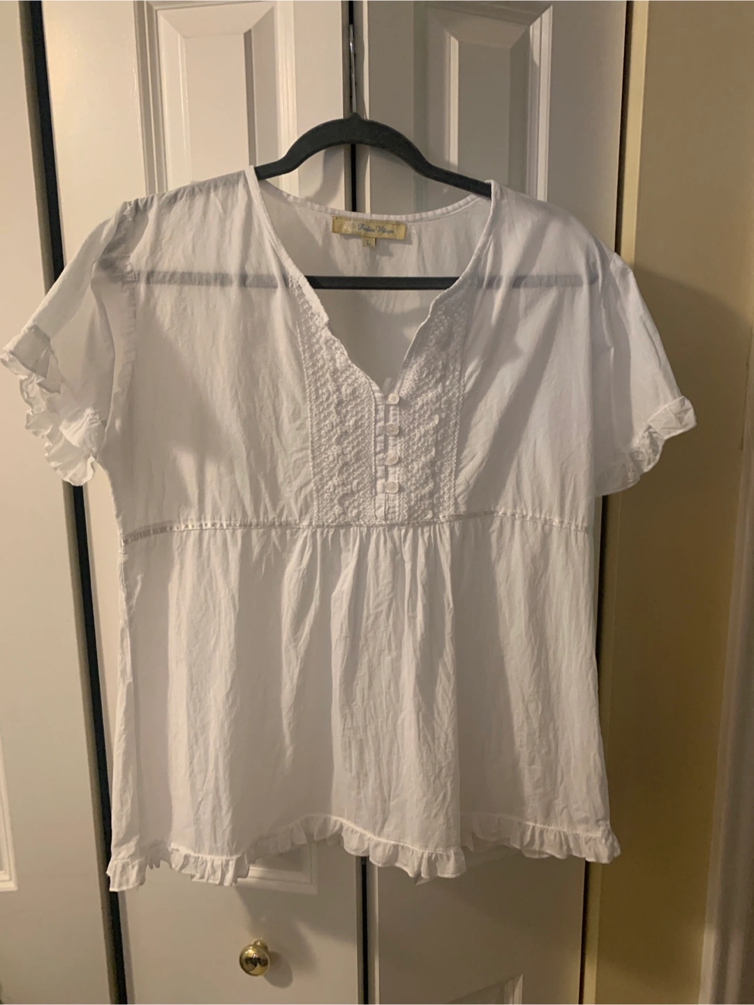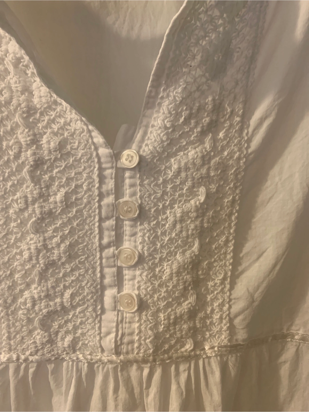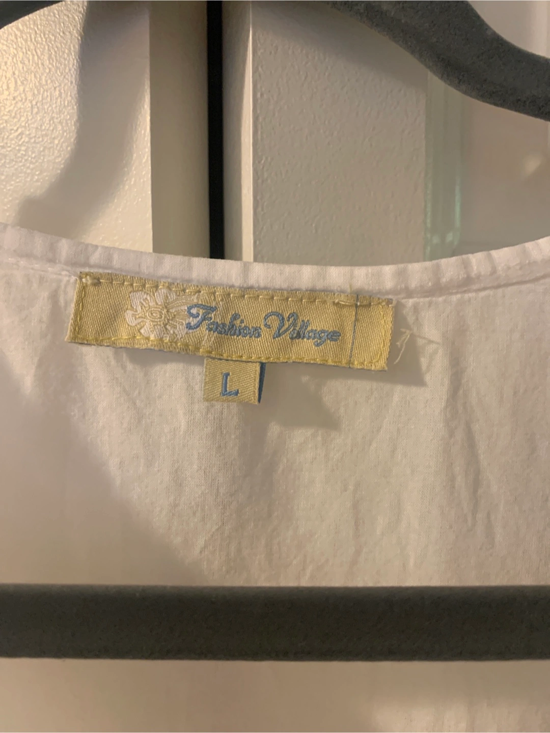 Here's a cute gorgeous white summer blouse from Fashion Village! It's a size large and features delicate detailing around the neckline and sleeves with four button and loop functional closures. It also has ruffled sleeves and bottom hemline, plus a silk ribbon across the bodice. It is 100% cotton from India. It's in great condition and ready for a new home! This is the perfect light and airy boho blouse you need in your wardrobe! Cash only please.
