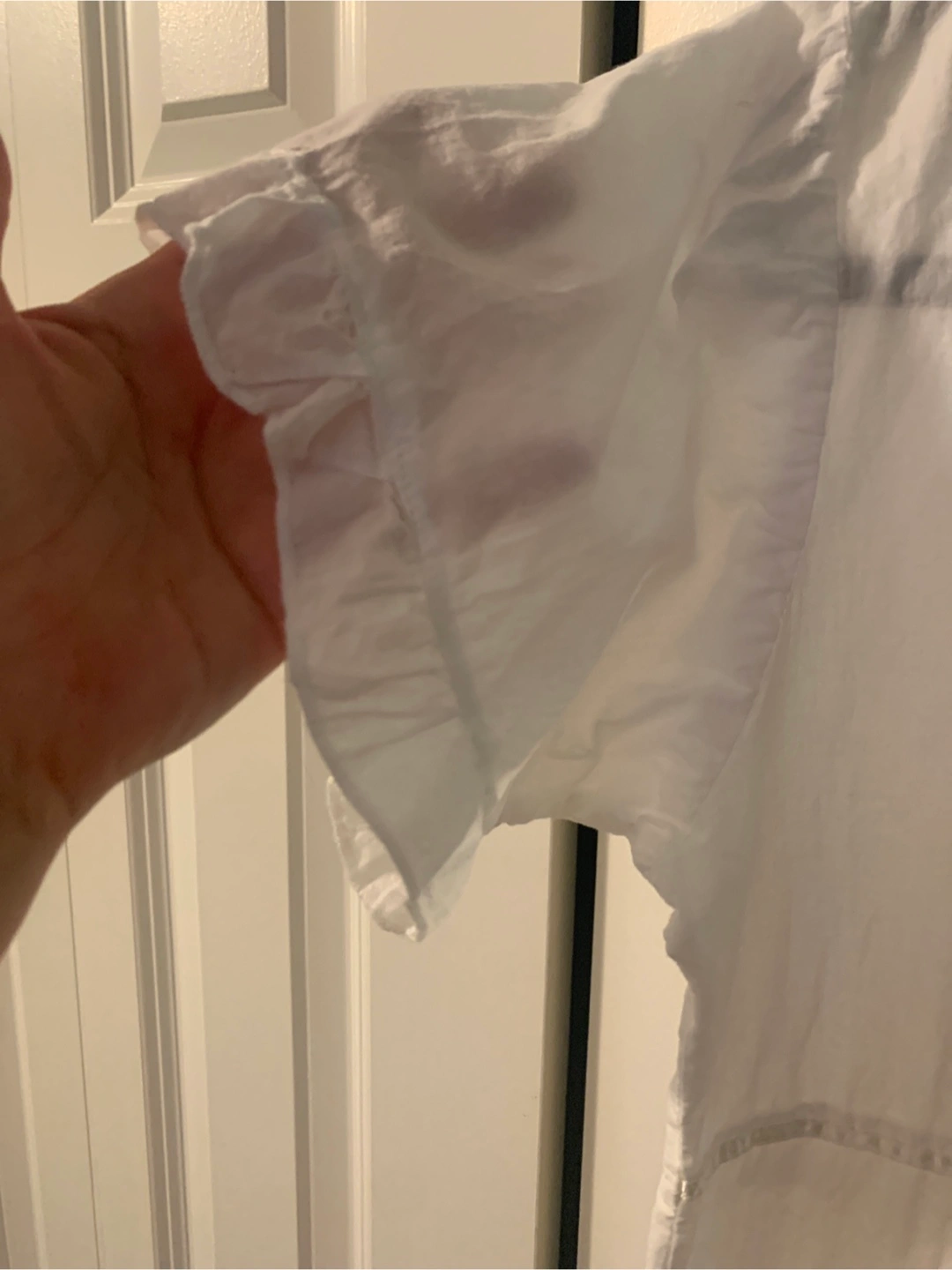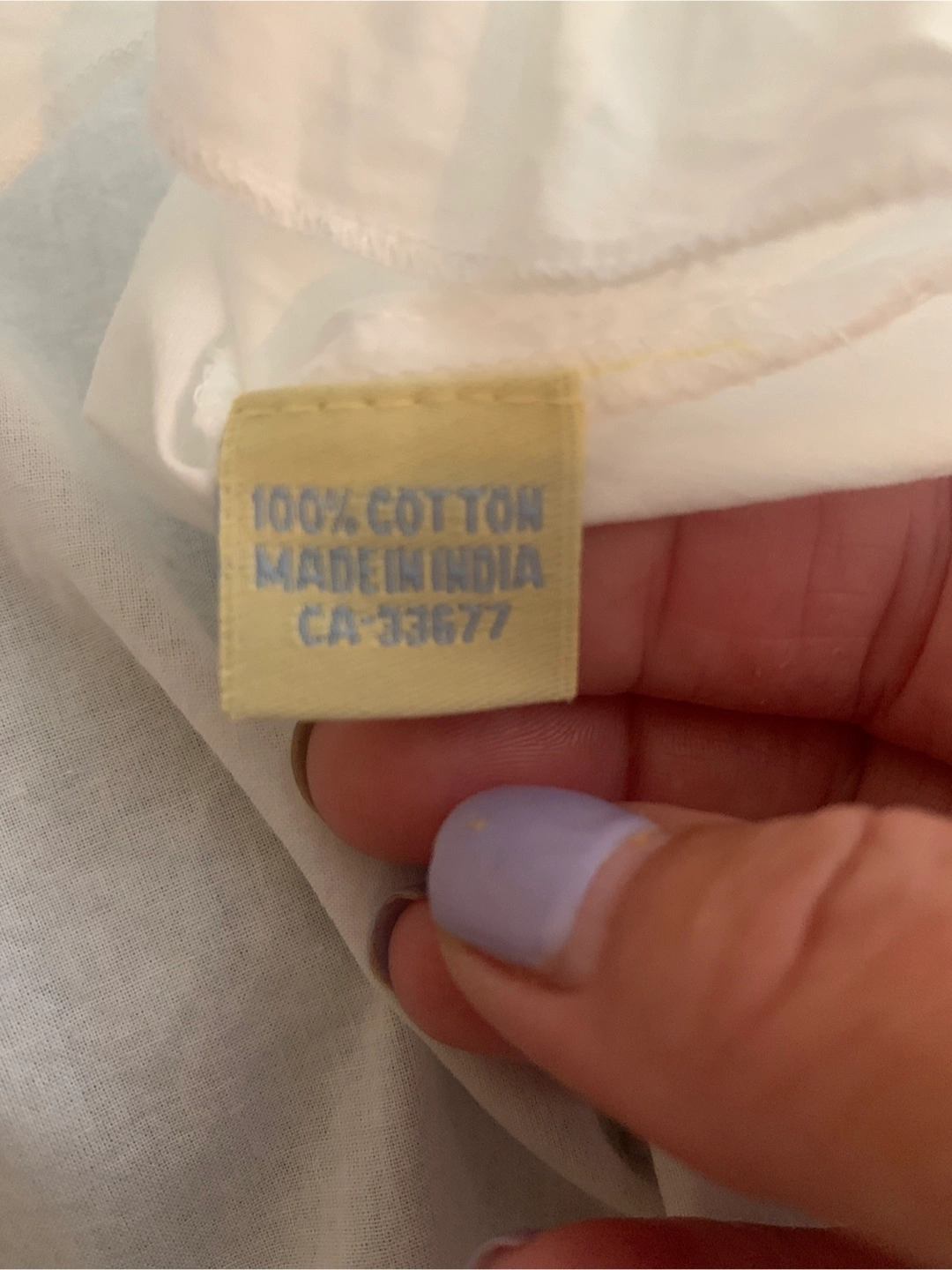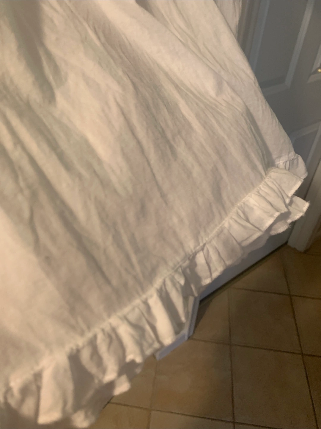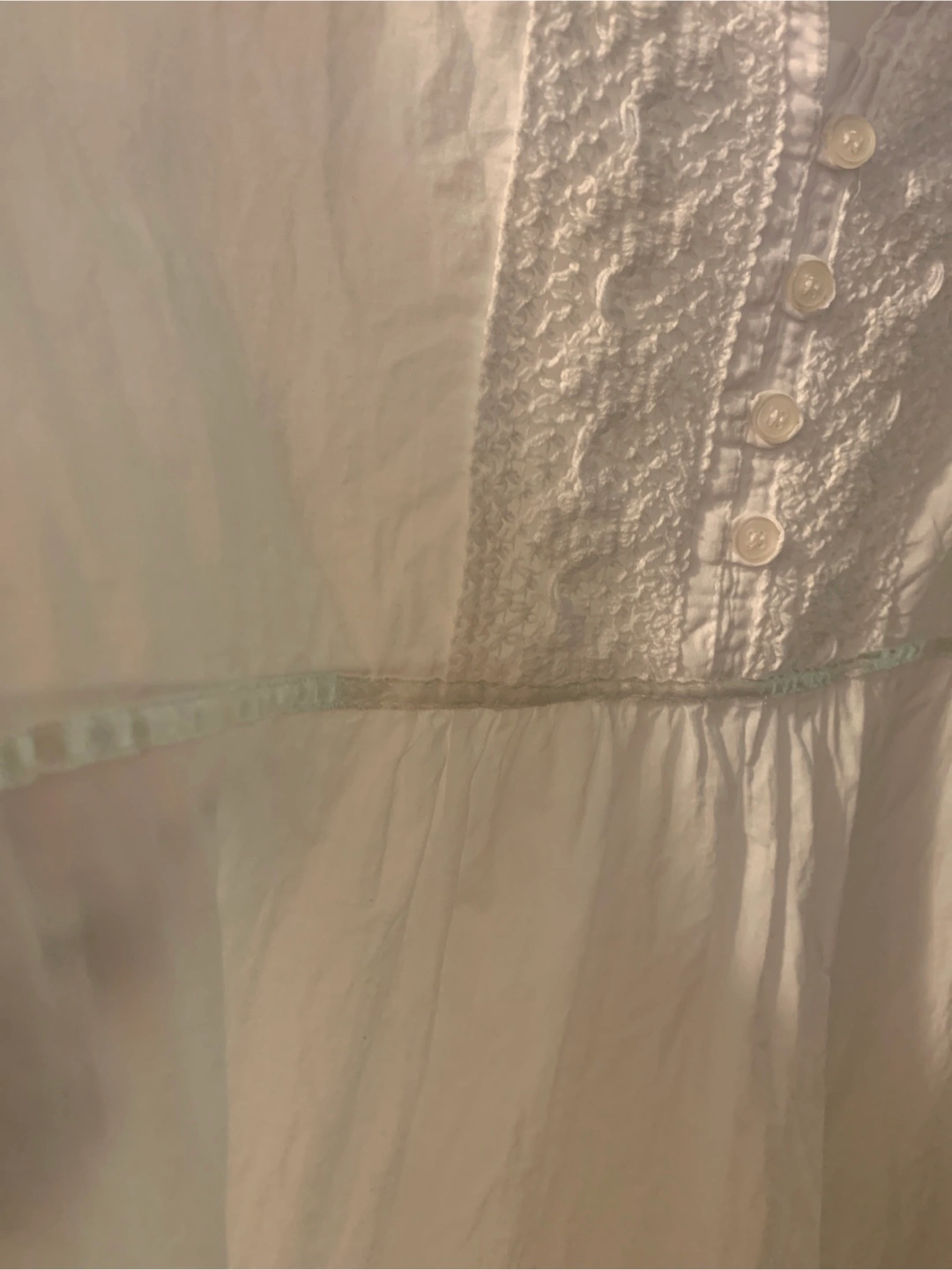 Here's a cute gorgeous white summer blouse from Fashion Village! It's a size large and features delicate detailing around the neckline and sleeves with four button and loop functional closures. It also has ruffled sleeves and bottom hemline, plus a silk ribbon across the bodice. It is 100% cotton from India. It's in great condition and ready for a new home! This is the perfect light and airy boho blouse you need in your wardrobe! Cash only please.