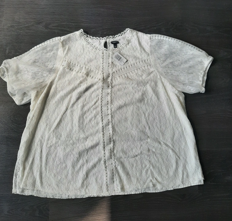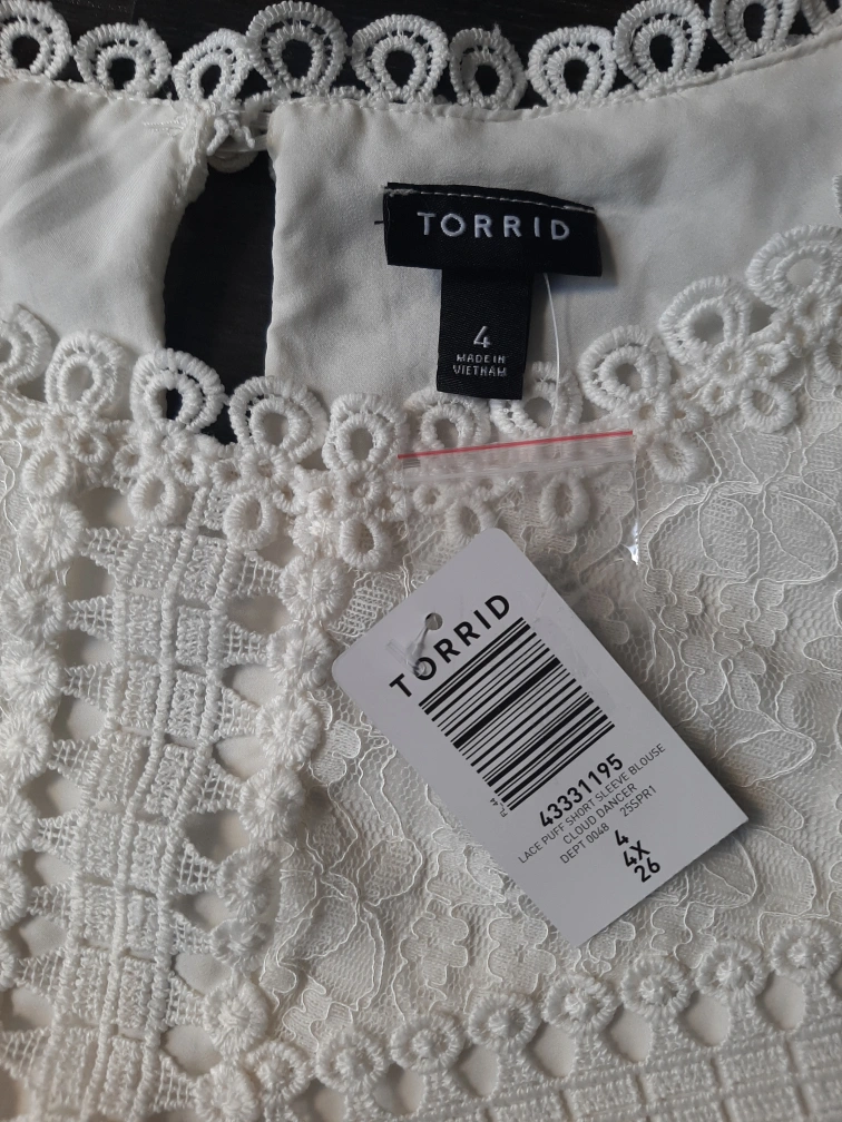 This is a beautiful lace puff sleeve blouse from Torrid in size 4. It's in excellent condition and ready for a new home! The delicate lace detailing and puff sleeves add a touch of elegance to any outfit
