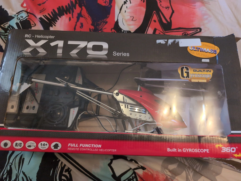 Selling an Ultimass X170 Series RC Helicopter. It's a full function remote controlled helicopter with a built-in gyroscope. Recommended for ages 14+.Never used just opened