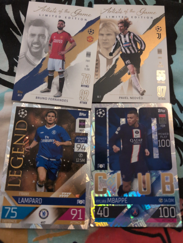 Selling all of above of Topps football player trading cards. Great for collectors! Limited edition Bruno Fernandes, Pavel Nedved,Kylian Mbappe and Frank Lampard are the best ones and they would normally go for 30$ alone.So this is good price πππ