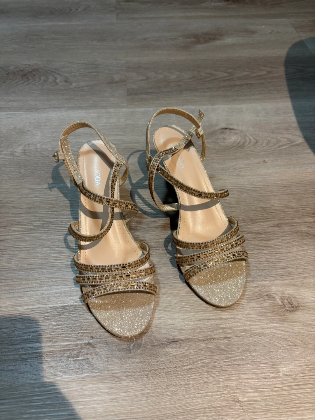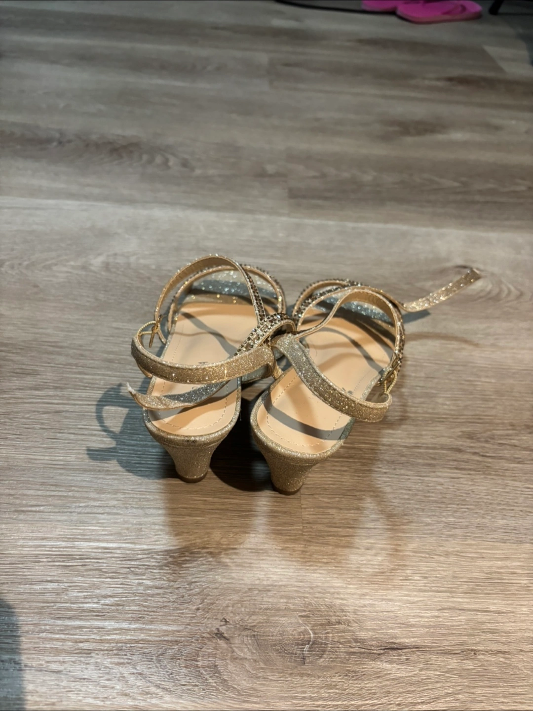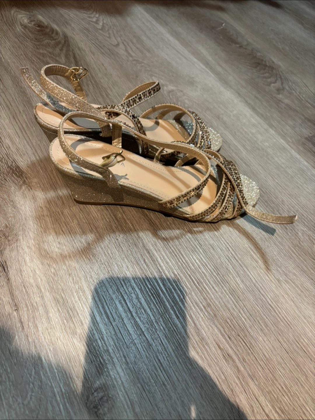 These Top Moda sandals are perfect for adding a little sparkle to your outfit! They're a gold glitter colour and feature a cute wedge heel. The size is 9.