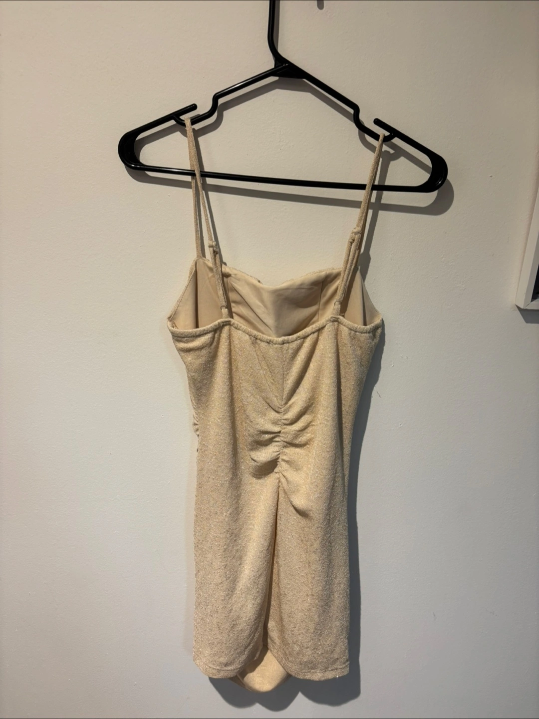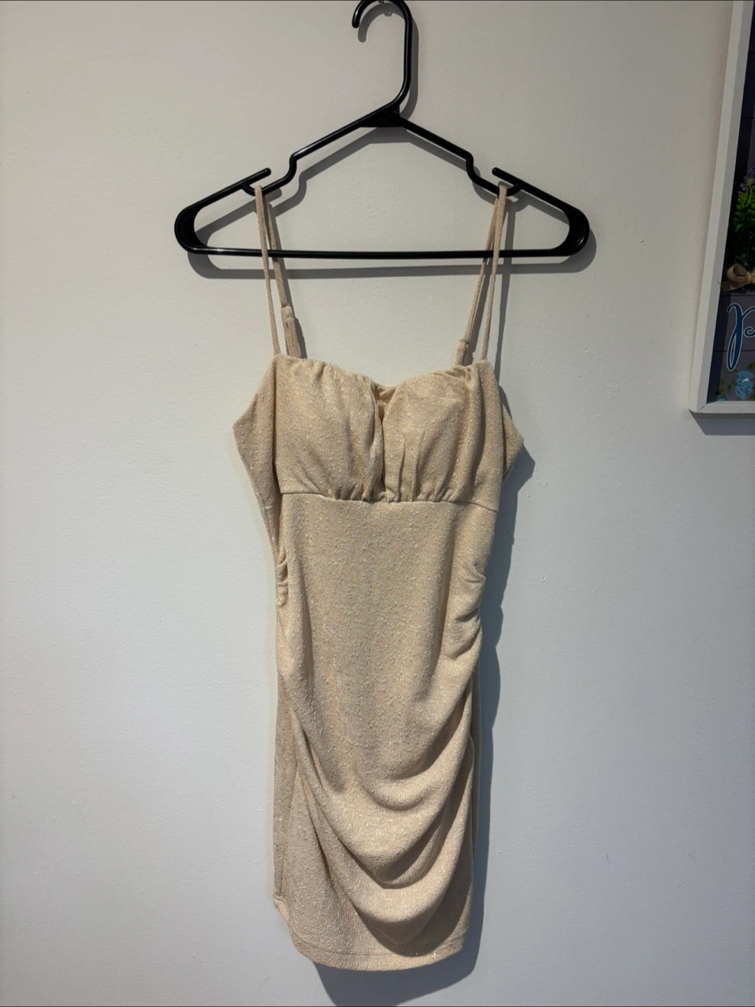 Here's a cute sparkly mini dress! It's a gold colour, perfect for a night out.
