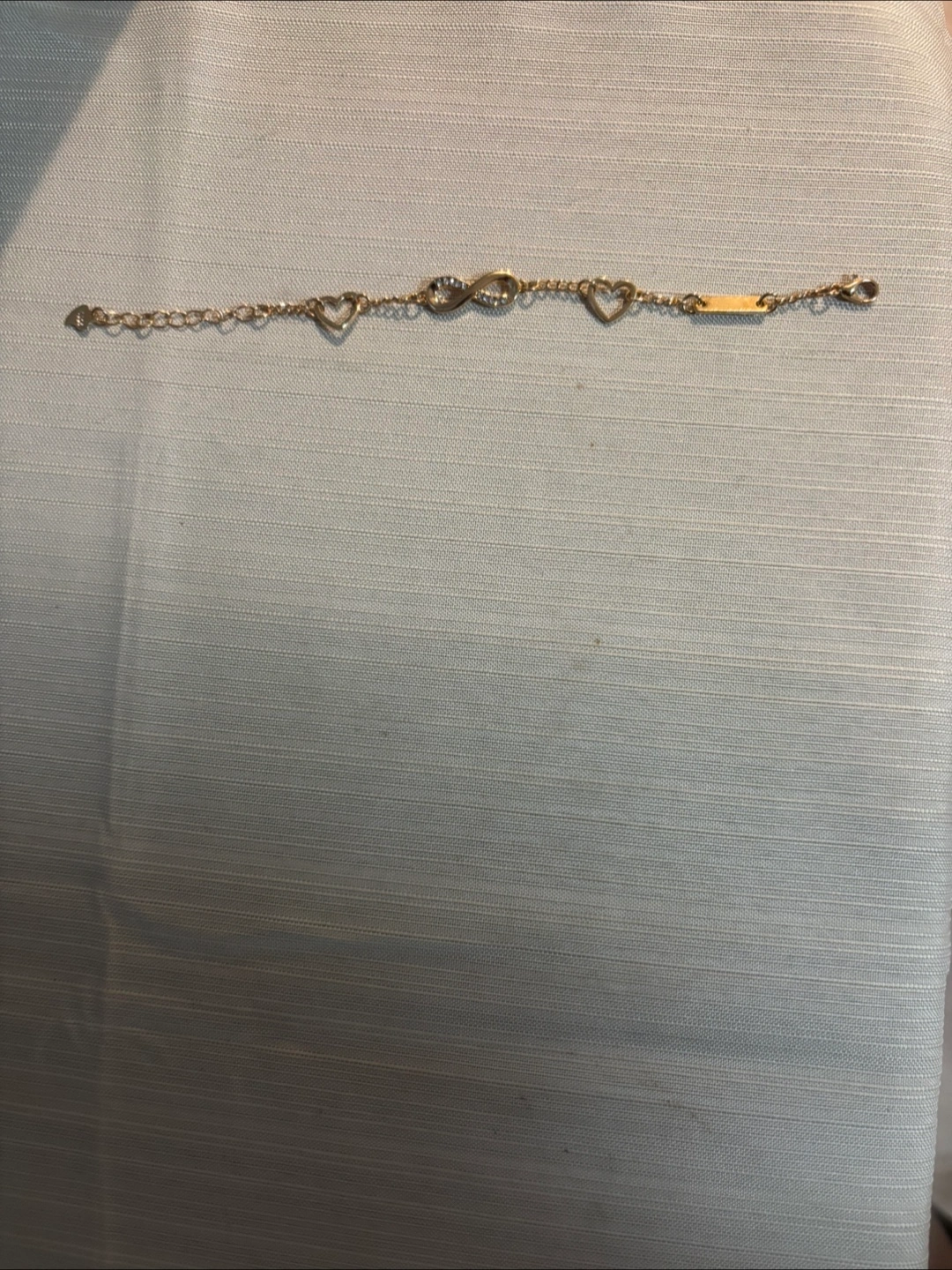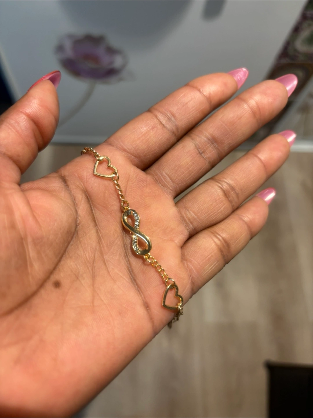 A lovely gold-coloured bracelet featuring an infinity symbol and heart charms! Perfect for adding a touch of elegance to any outfit. Fits someone with a small wrist. You can visit www.glamisky.com to get this bracelet and other cool jewellery at 80% off with my discount code: ROCHELLEBERTRAM