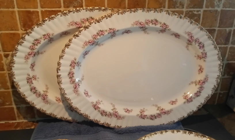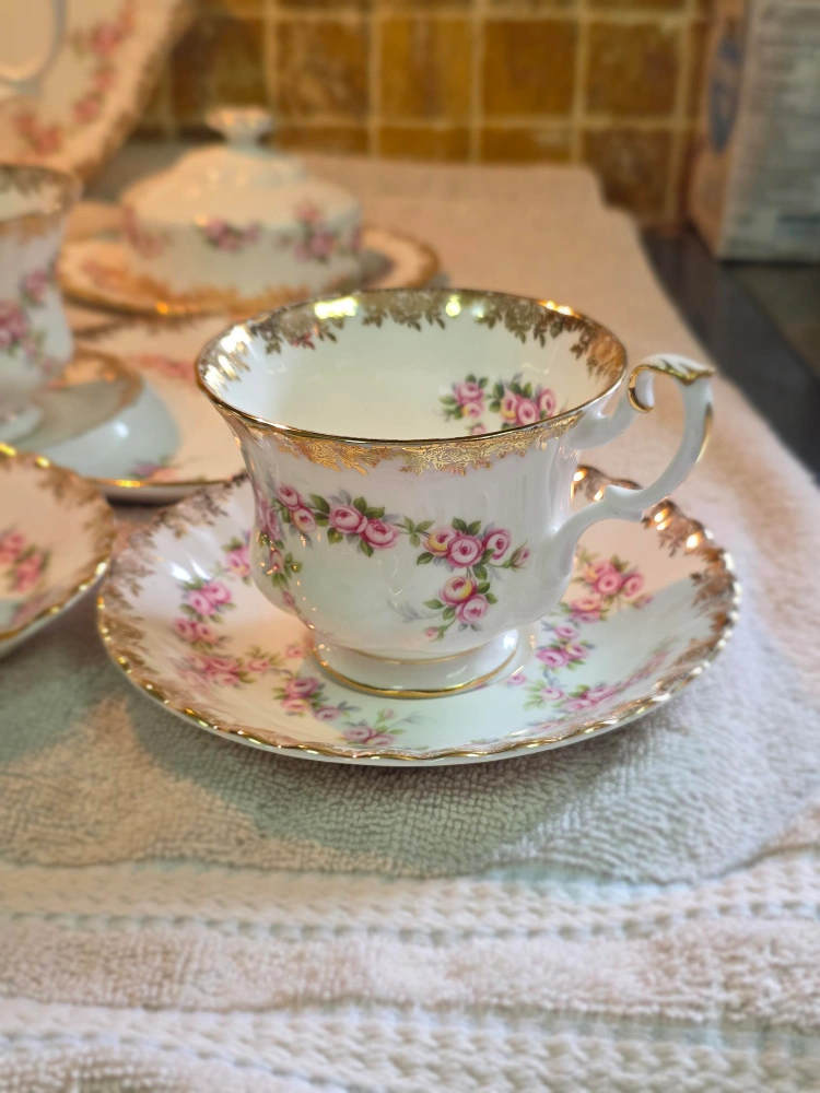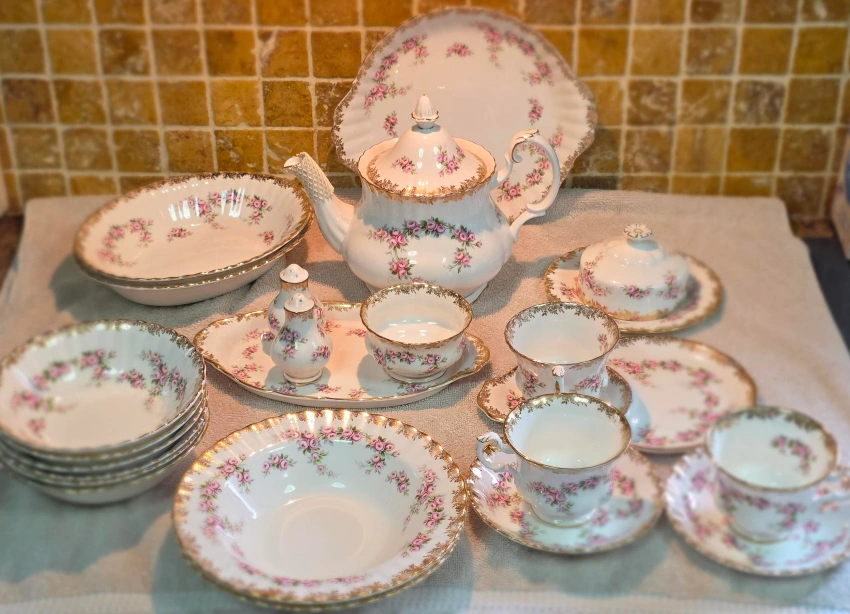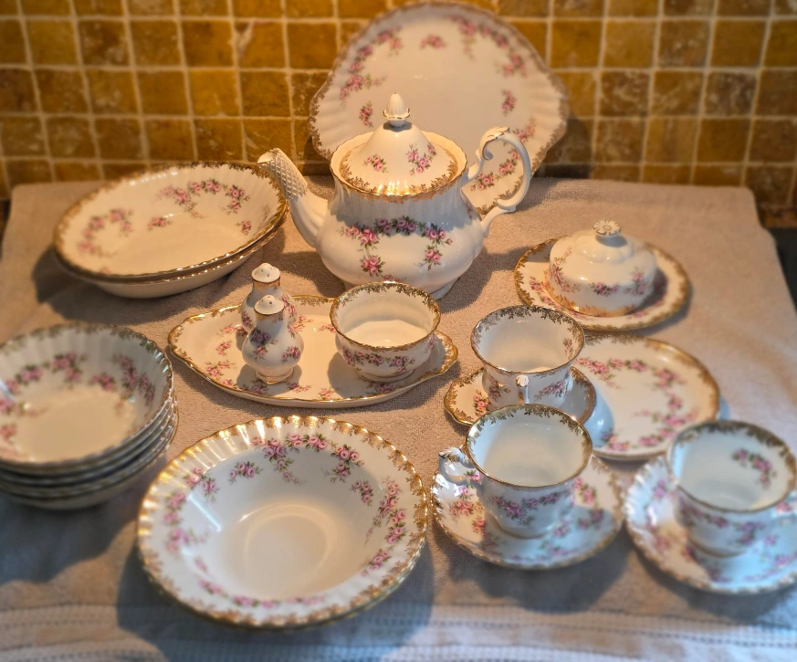 Royal Albert " Dimity Rose " Collection, Prefer Selling as a Bundle Everything is in Like New Condition, Buy for one amazing Price or everything is priced individually and is Firm I added 2 large Meat Platters so Price is Firm ! Included are 1 x Teapot - $155.00 1 x Sugar Dish -$25.00 1 x Regal Tray for the Cream and Sugar -$ 30.00 1 x Butter Dish and Lid - $45.00 1 x Salt and Pepper Shakers - $25.00 2 x Oval Veggie Dishes - 40.00 Each 2 x Rimmed Soup Bowls -$40.00 1 x Tennis Set (Tray and Teacup) $30.00 4 x Cereal Bowls-$ 75.00 - 1 Sold - Price adjusted 1 x 2 Handled Cake Plate $30.00 2 x Large Meat Platters - $90.00 Each Teacups Shown in photos are gone as well as 1 Cereal Bowl. Please Pickup Clarkson Area Mississauga or I offer Delivery Willing to Ship at Buyers Expense Accepting Cash or Etransfer Only Please take time to view my other Ads for more Collectibles and China Sets
