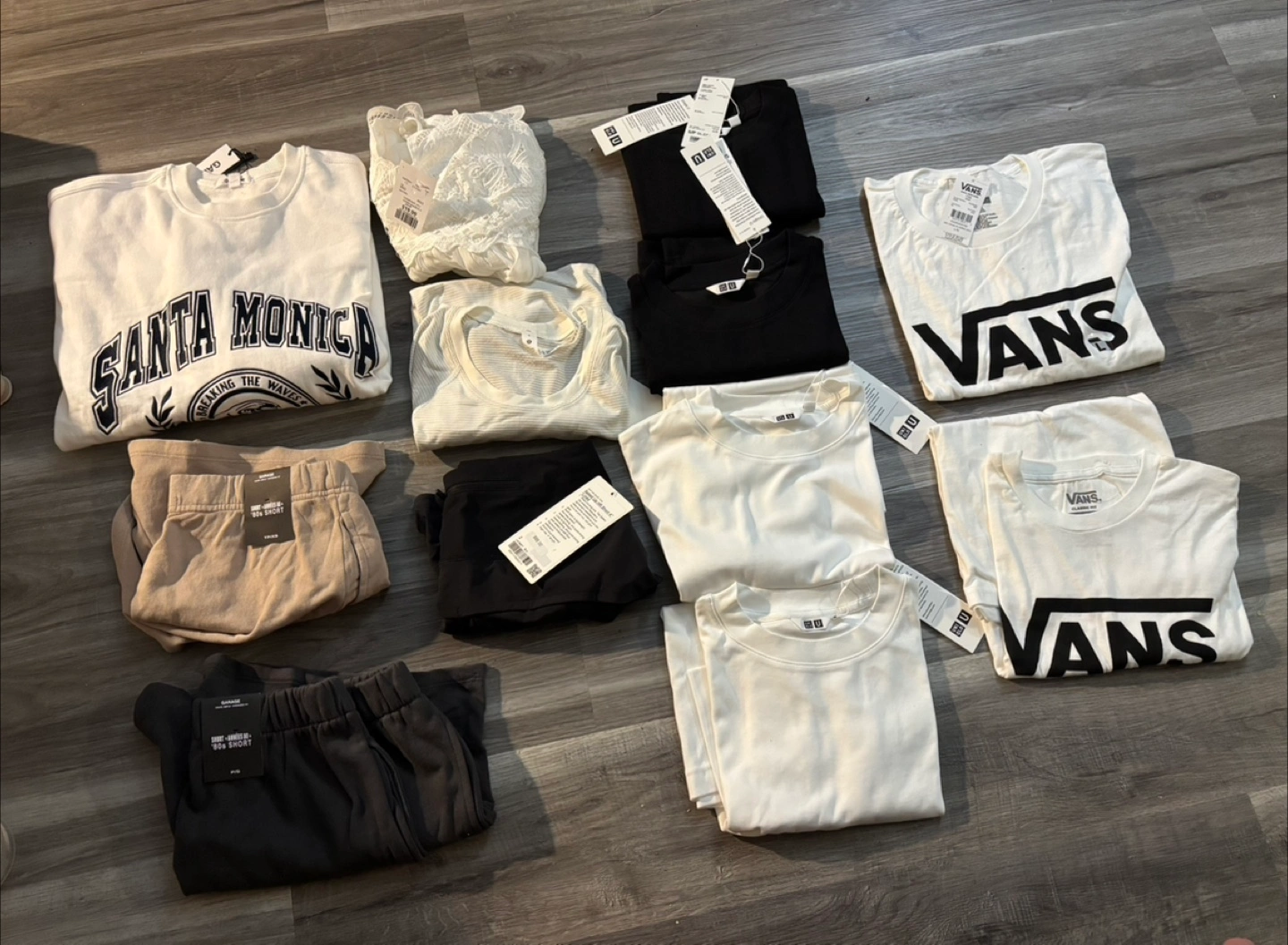 Selling a bundle of clothes including items from Uniqlo, Vans, and Garage. All items are in great condition and ready for a new home! 1 - Santa Monica — S 1 - Grey Garage Shorts —S 1 - Beige Garage Shorts — XS 2 - Black Uniqlo Shirts — S 2 - White Uniqlo Shirts — S 1 - Vans Shirt — M 1 - Vans Shirt — L 1 - Lululemon Shorts — 2T 1 - Grey/Beige Lululemon Long Sleeve — 4 1 - Lace Rebellion Top — XS