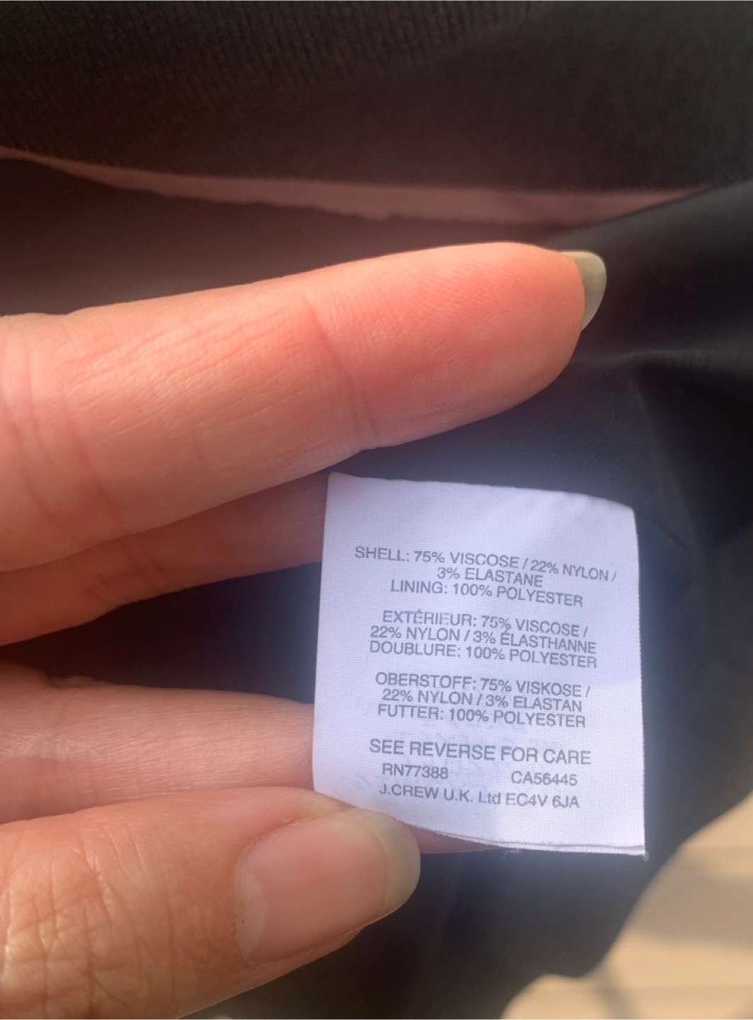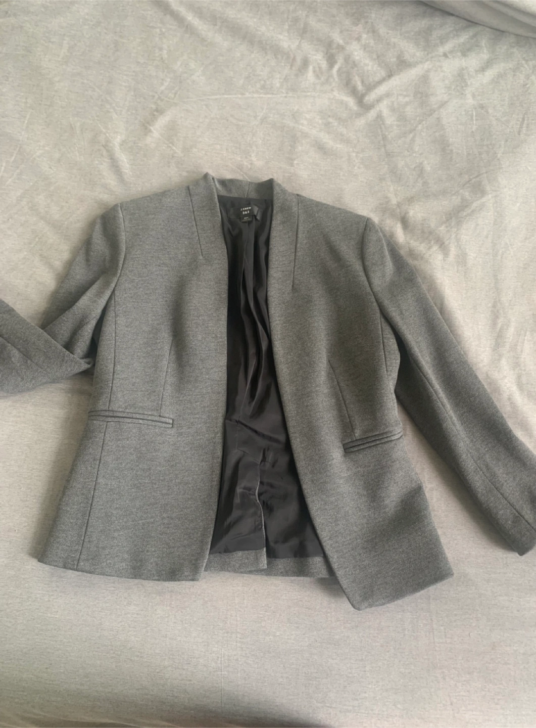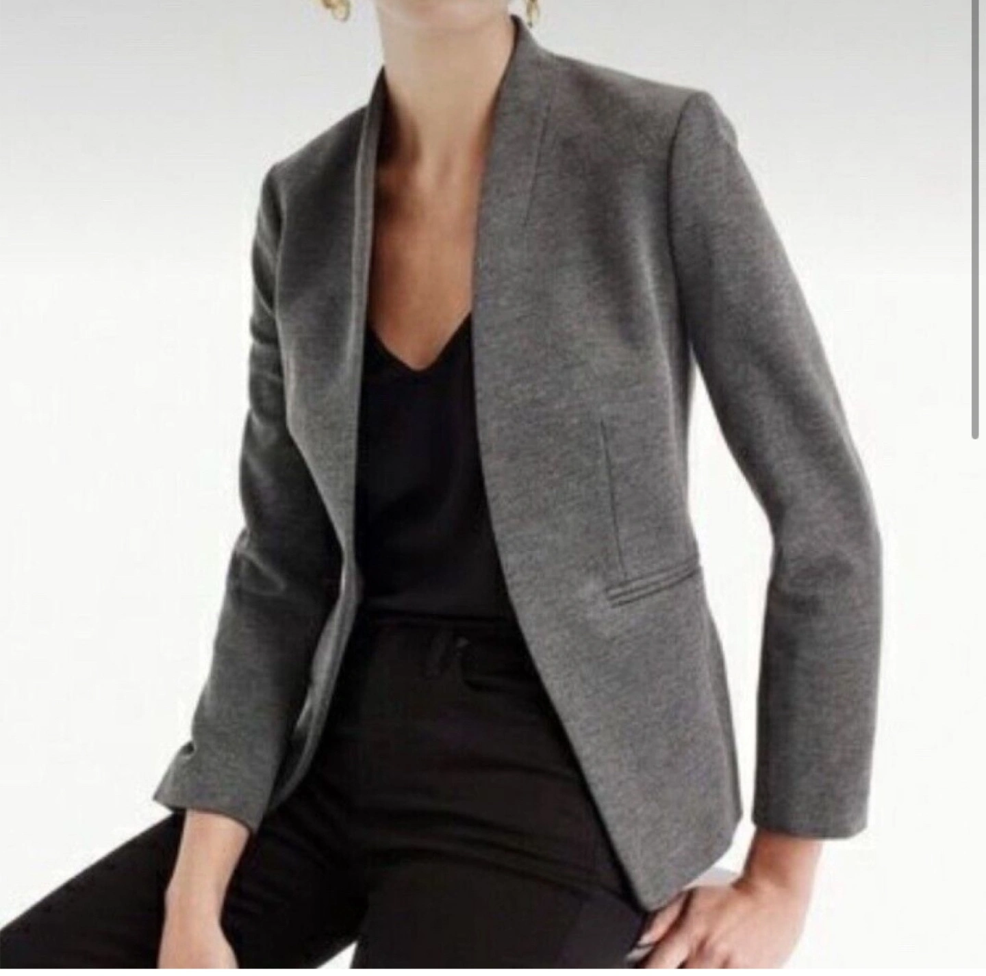 Sophisticated, modern, open-front grey blazer by J Crew. It's in excellent condition and perfect for layering. The shell is made of 75% viscose, 22% nylon, and 3% elastane, with a 100% polyester lining. Structured suiting material for a flattering fit. Retail was around $145.