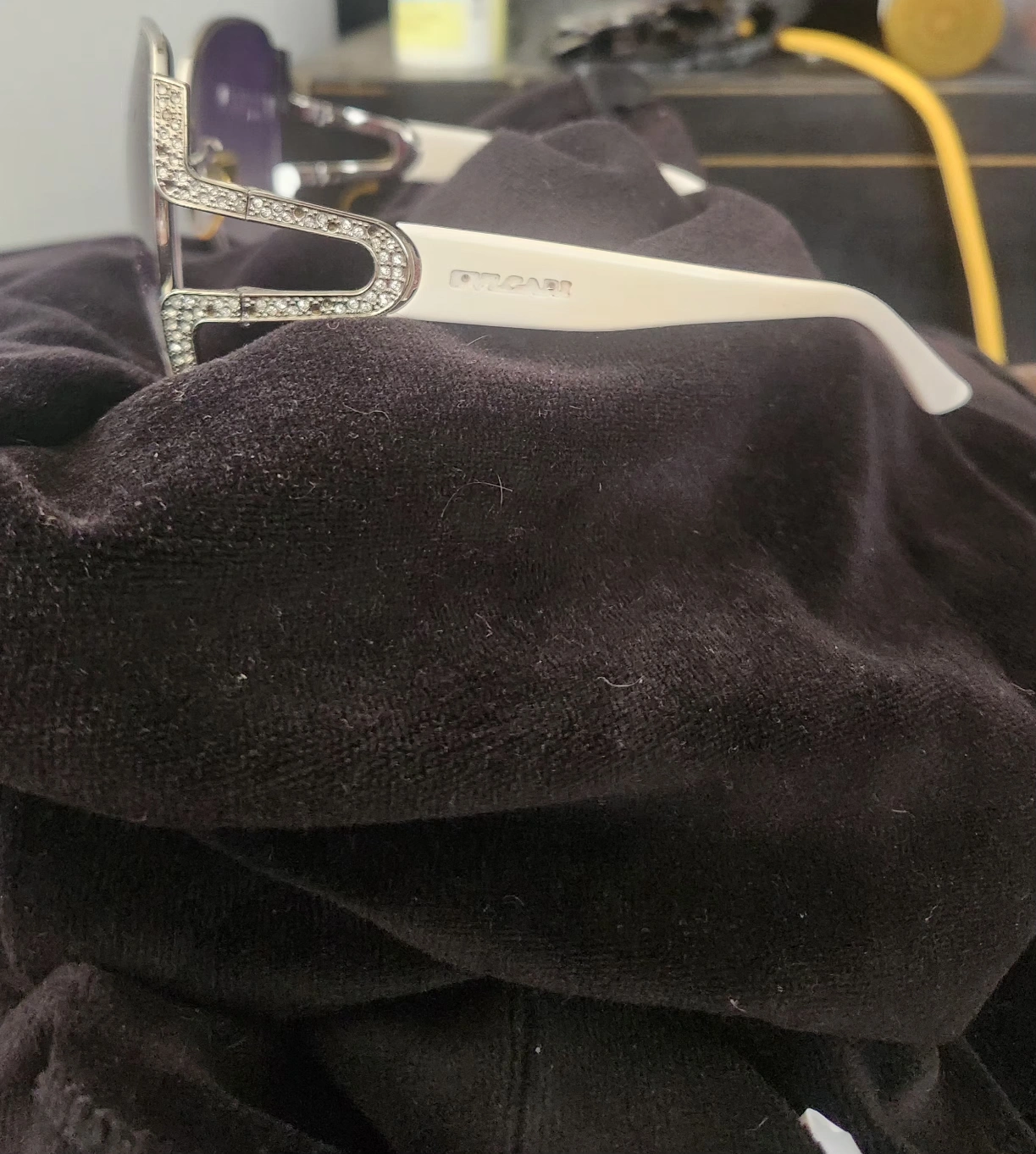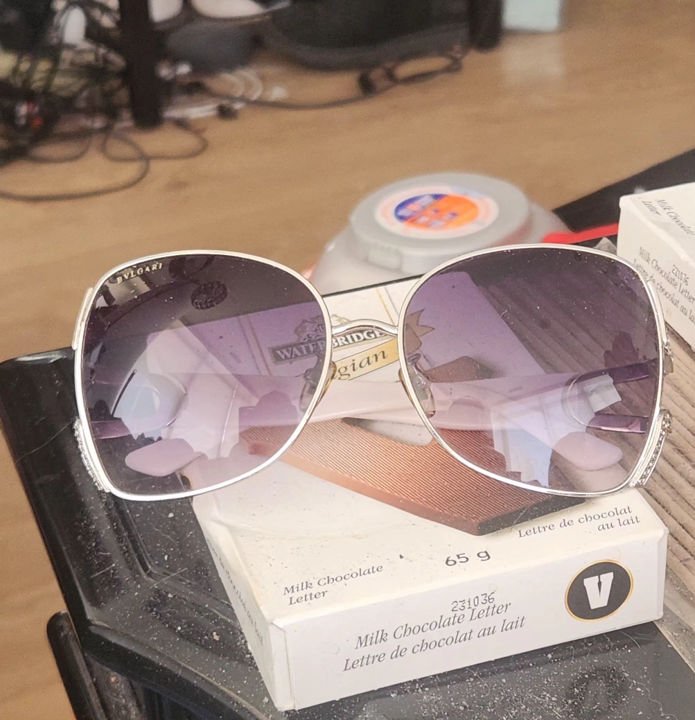 Selling a pair of BVLGARI sunglasses. They have a stylish design with silver frames and purple tinted lenses. The sides feature decorative detailing. Great for adding a touch of luxury to your look! * Cash Only * * No E-transfers * * Pickup Only * * Serious Offers Only *