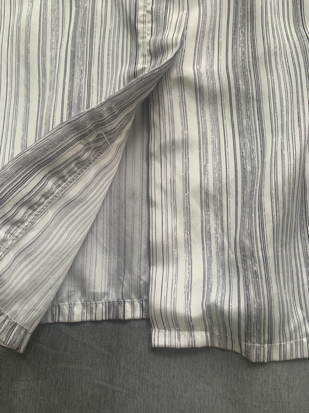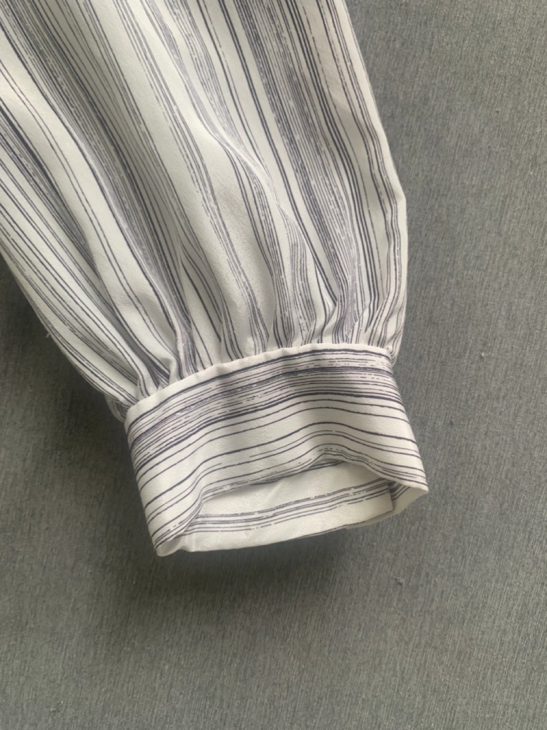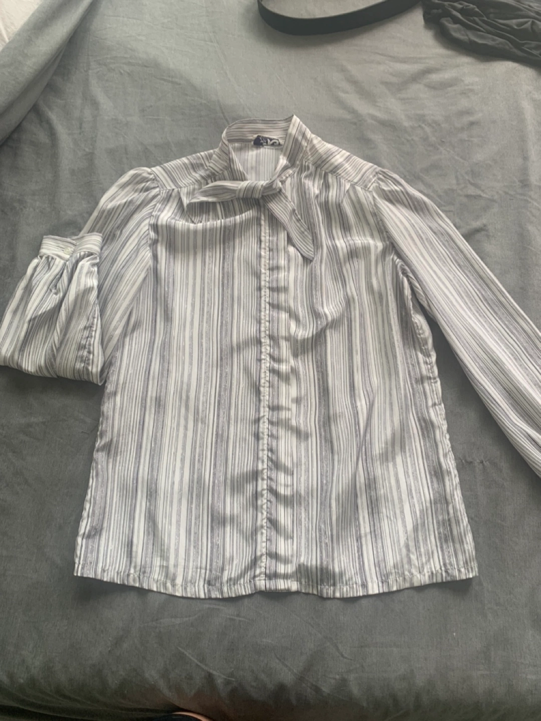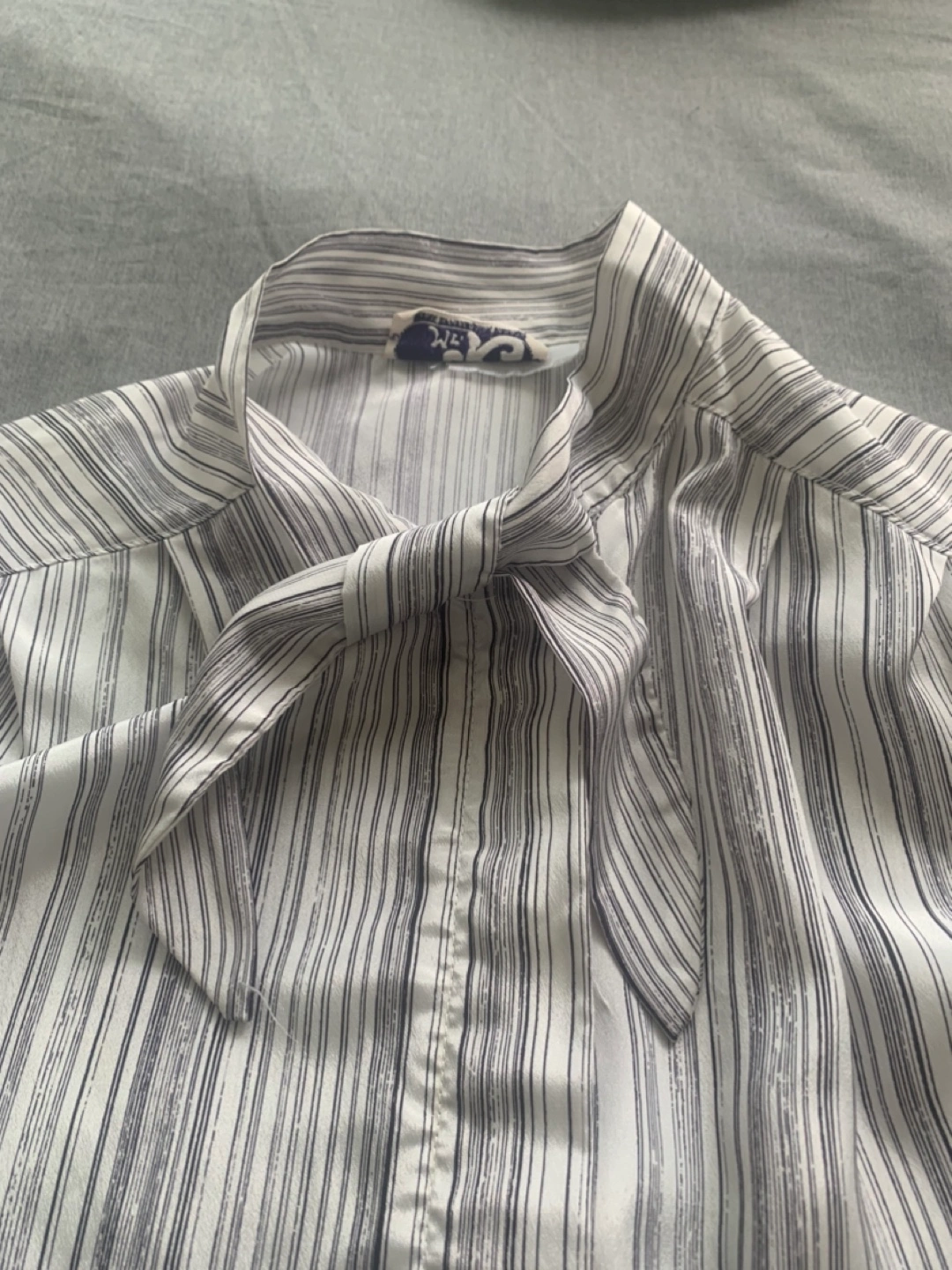 Elegant striped blouse with a tie-neck detail. The material is lightweight and comfortable - though I know cause I can’t read the material tag. This is made in Canada - back when Canada had clothing manufacturers! Brand is Mr K. Bottom button is missing as shown in photo but otherwise in good condition.