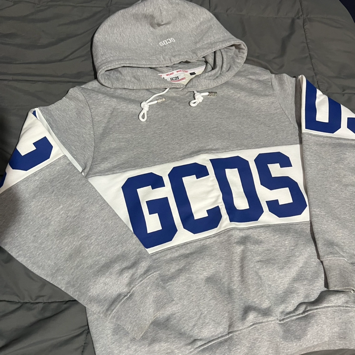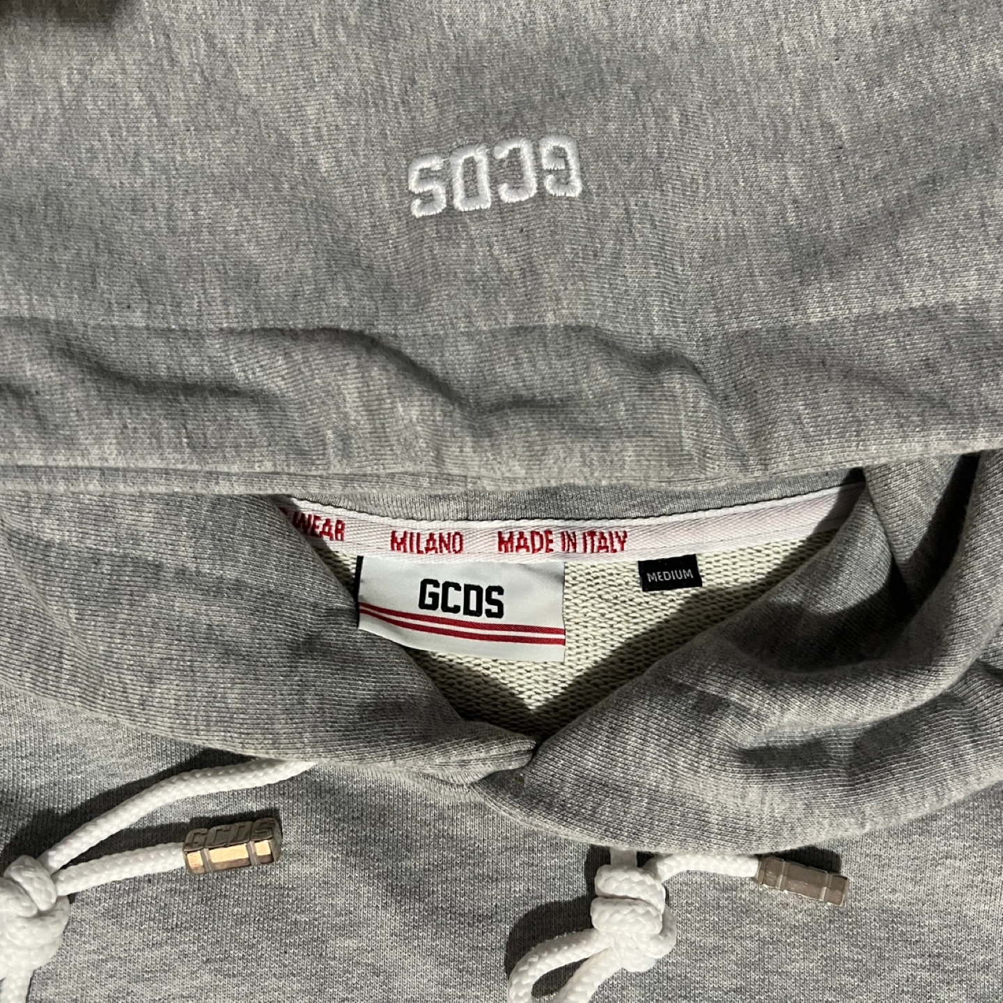 Selling a GCDS hoodie in grey, size medium. It's in new just removed tag, never used. It is not fake, genuine made in Italy. The hoodie features the GCDS logo prominently on the front. Perfect for casual wear.