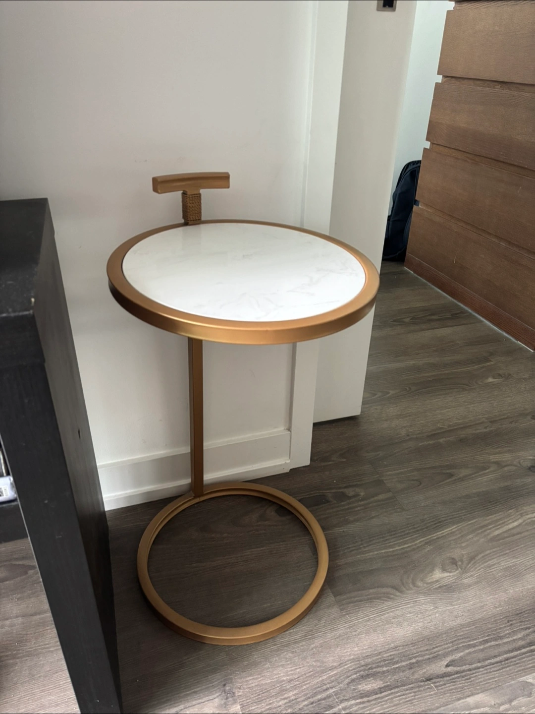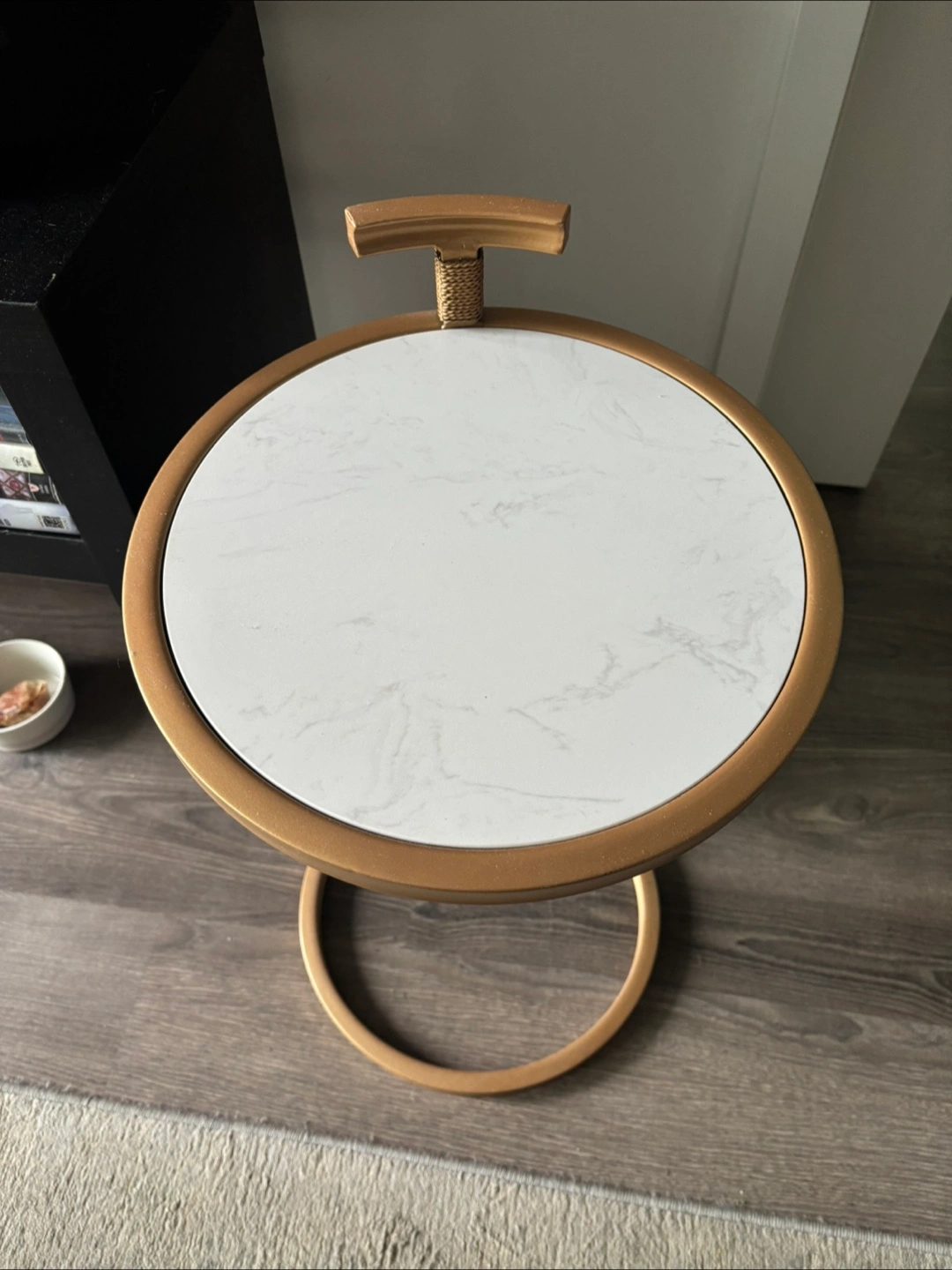 Add a touch of elegance to your space with this stylish gold accent table! It features a faux marble top and a sleek, modern design. Perfect for displaying plants, lamps, or your favourite decor items. It's in great condition and ready to find a new home!