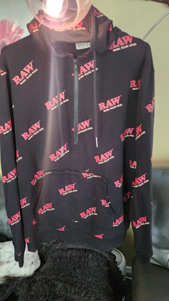 Raw hoodie with facemask and filter pocket. The front pocket is a fold-out rolling tray revealing a hidden zippered stash pocket. bought as a novelty item at a smoke shop and only worn once or twice.