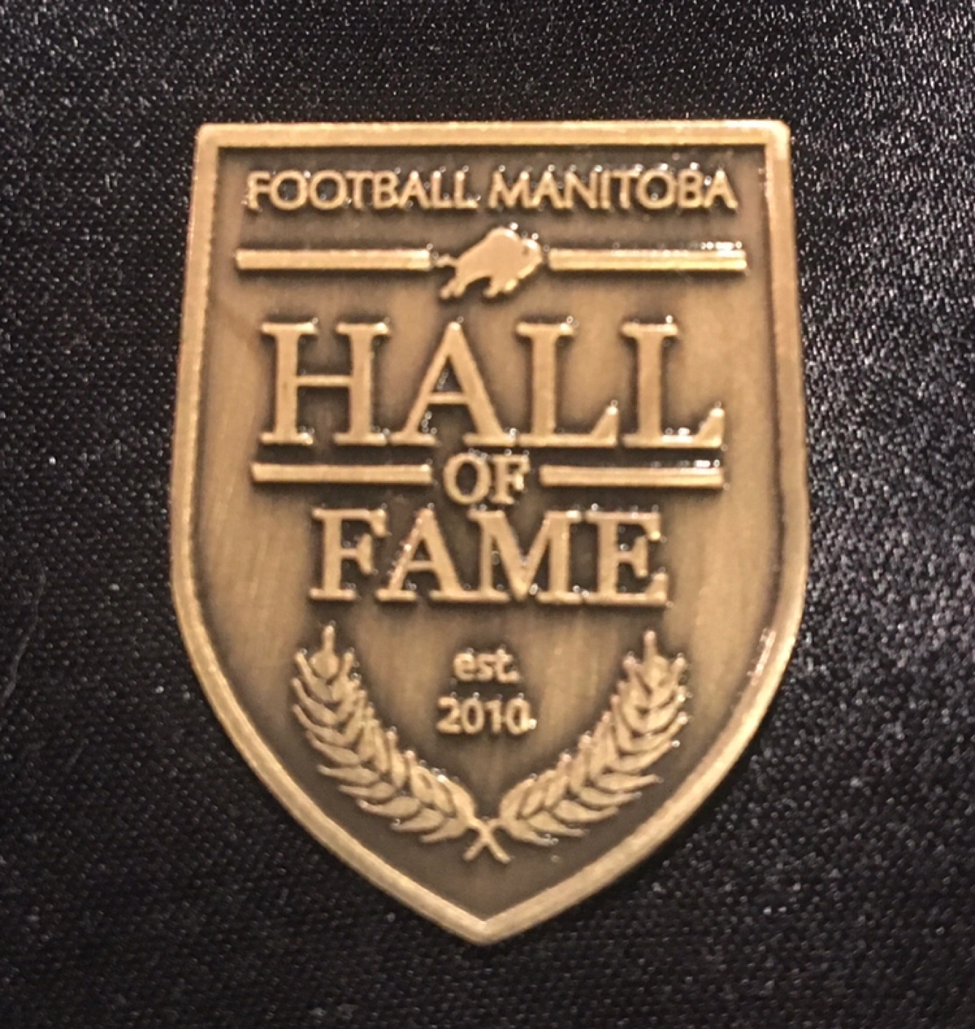 Selling a Football Manitoba Hall of Fame pin. It's in great condition and features a shield design with a buffalo on top and wheat stalks at the bottom. A nice piece for any football fan or collector!