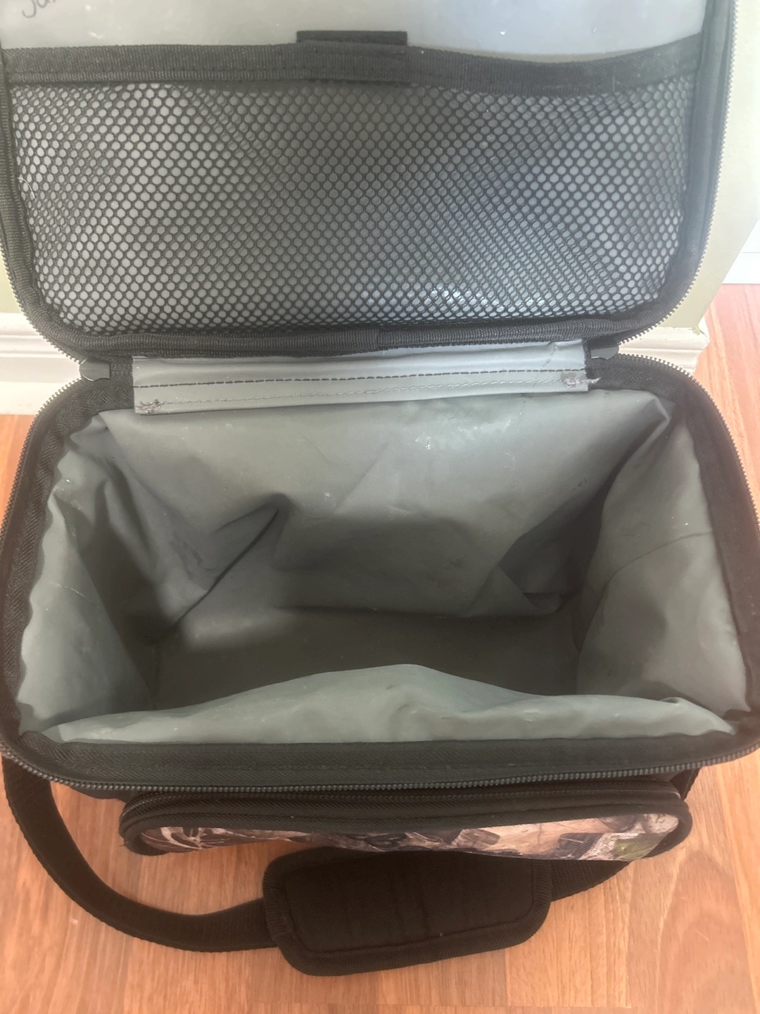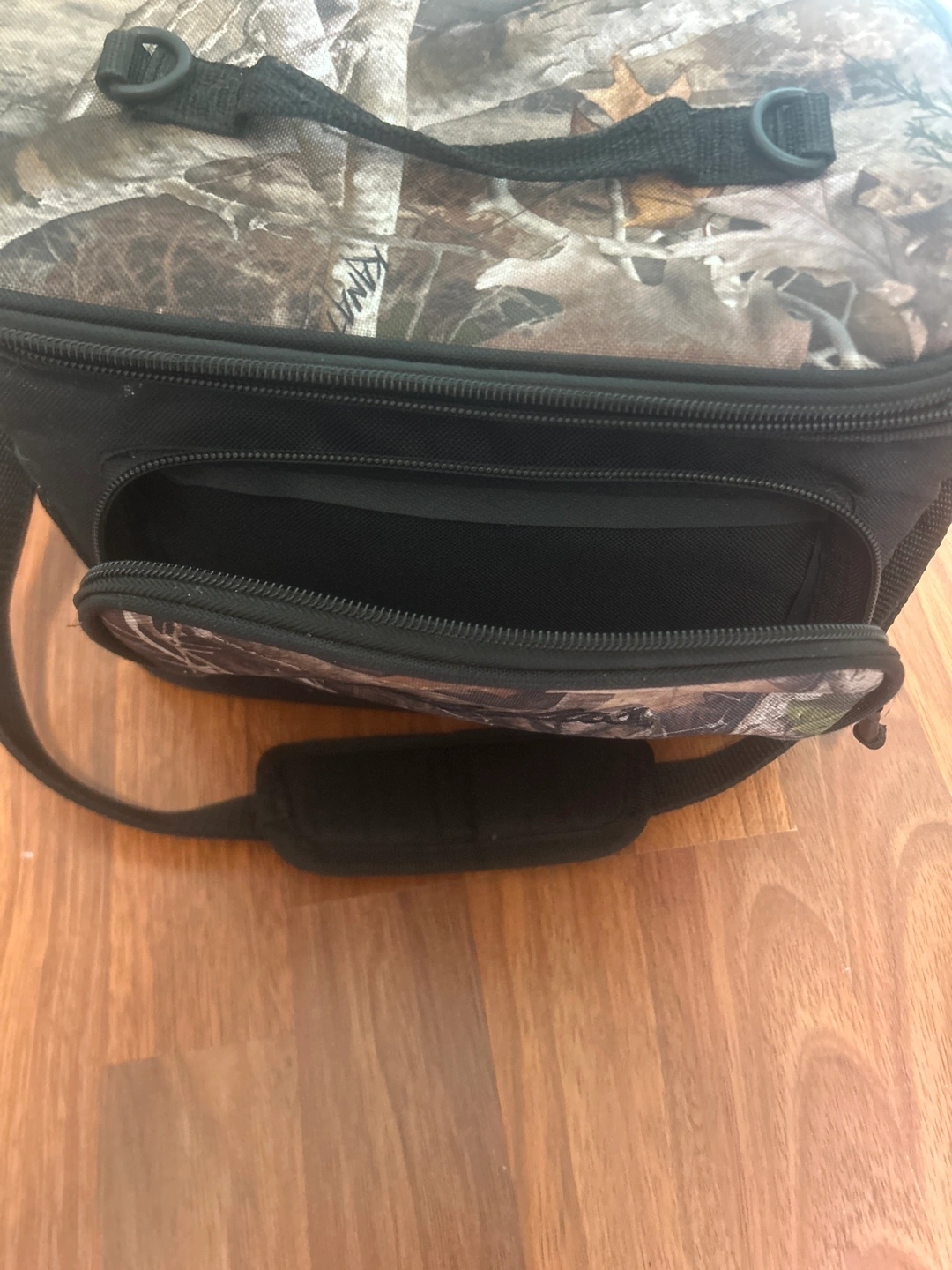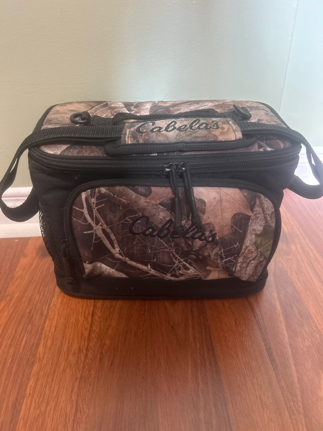 Cabela's cooler bag in a camo print! It has a top handle and a shoulder strap. Perfect for keeping your drinks and snacks cold on the go