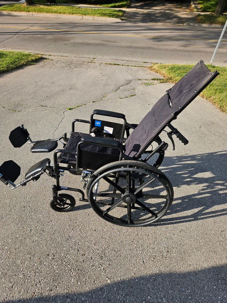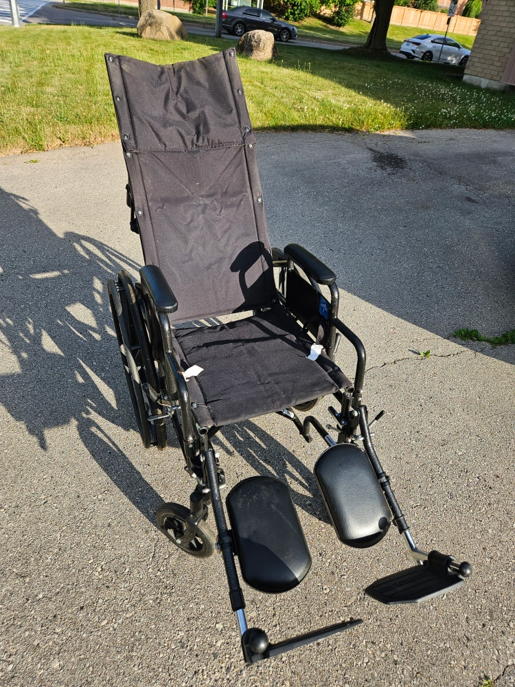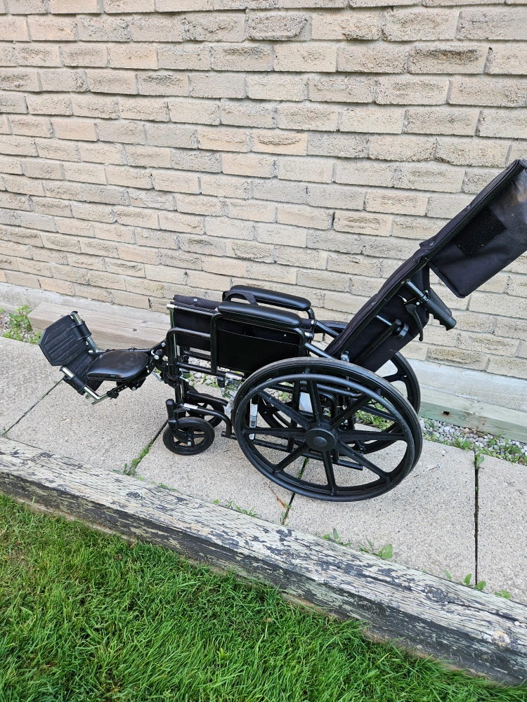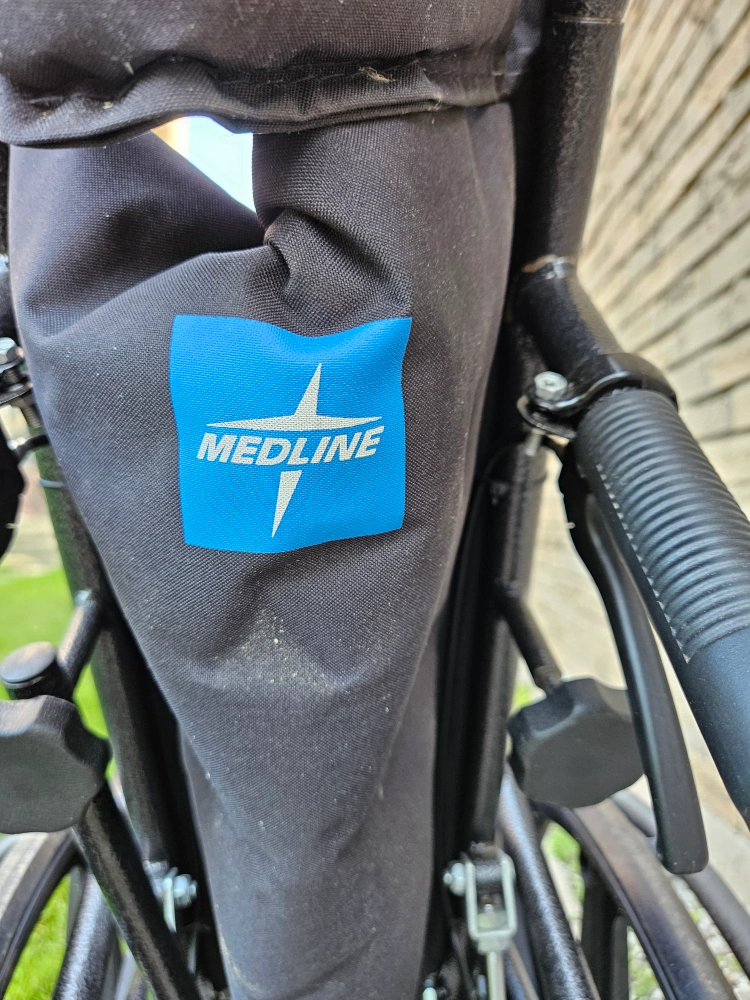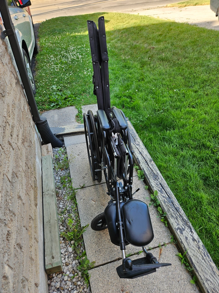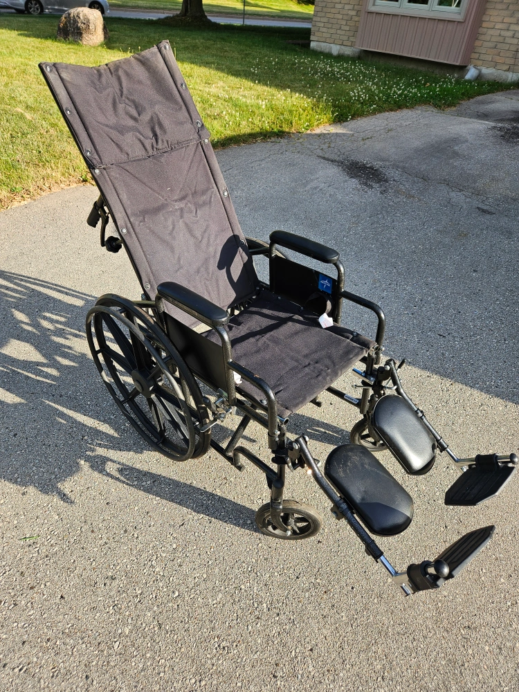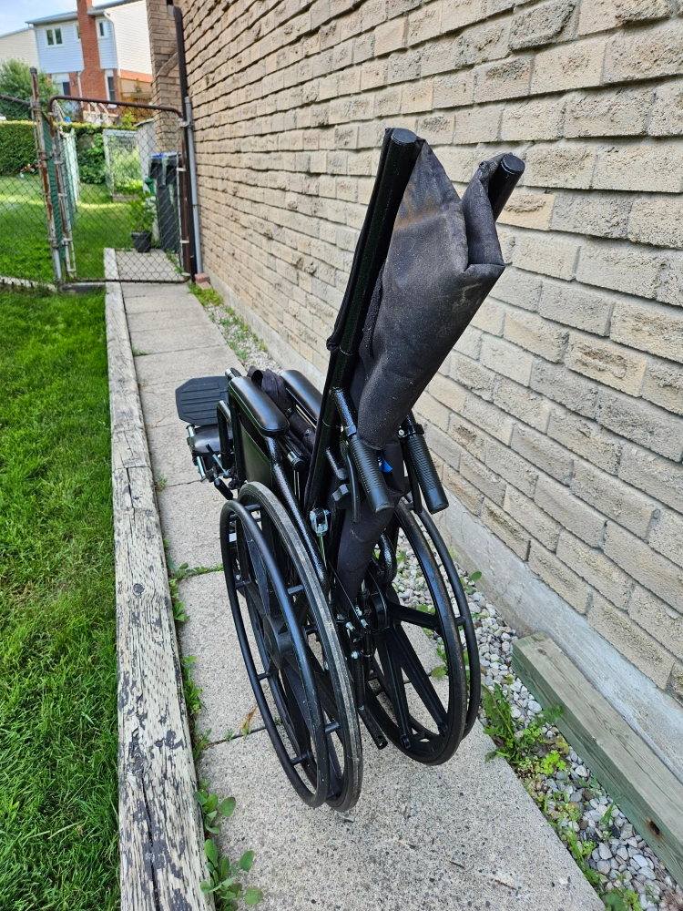 Selling a Medline folding cloth wheelchair. Nice and light, easy to transport. In good shape. Has a small rip in the leg rest and needs a good cleaning as it sat in my shed over the winter.