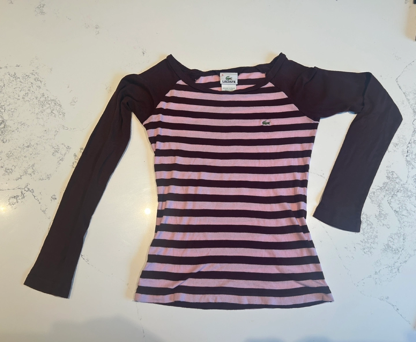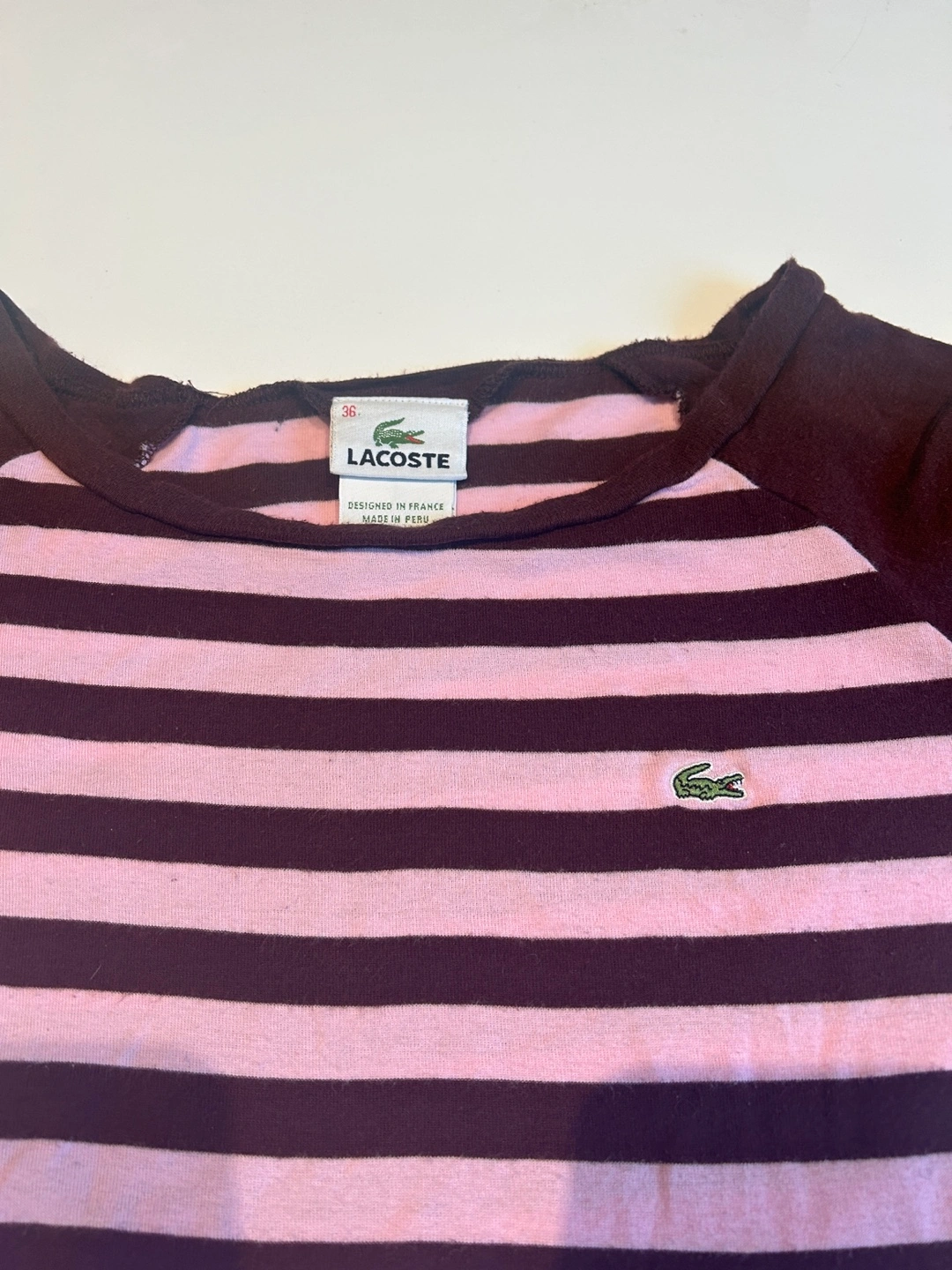Super cute (and soft!) Lacoste long-sleeve too in pink and burgundy! Size 36 (small), made in Peru, designed in France. That croc is so cute 🐊 ☺️ minor imperfection (see pic) at the top in the back—not visible at all, probably from the tag. Pick up in the Beaches at Queen and Victoria Park.