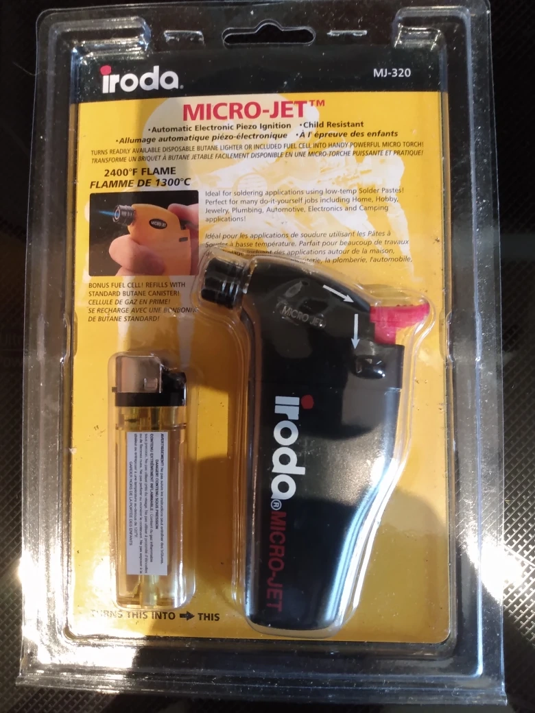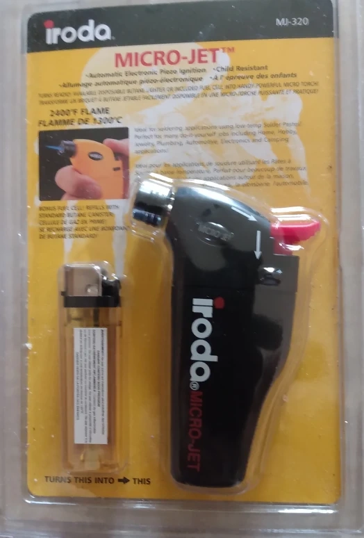 Selling an Iroda Micro-Jet MJ-320 torch, still in its original packaging! It features automatic electronic piezo ignition and is child-resistant. Perfect for soldering applications, hobby, jewelry, plumbing, automotive, electronics, and camping applications