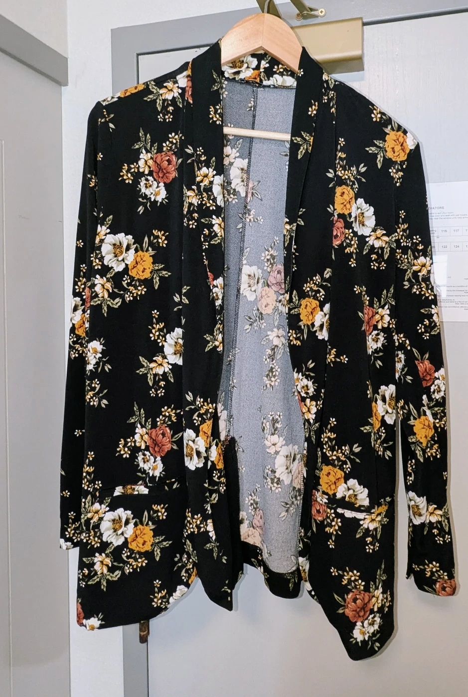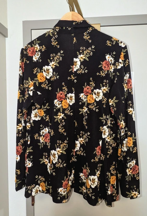 Selling a cute floral blazer in black! It's a size medium and can easily fit a large. Features a lovely floral pattern. Perfect for adding a touch of style to any outfit