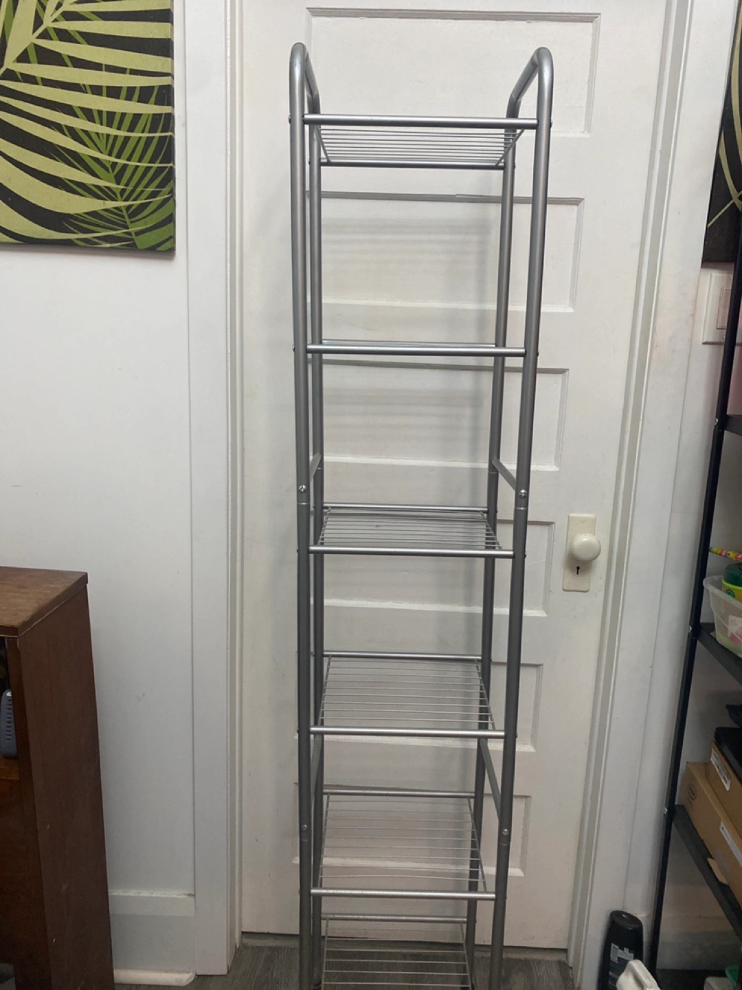 Selling a handy silver metal shelving unit! It has six tiers, perfect for organizing in a small space. Great for bathrooms, closets, or pantries. It's in good condition and ready for a new home