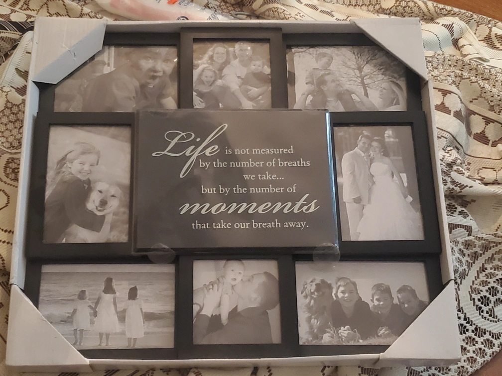 Selling a Life Moments picture frame with 8 openings! It's perfect for displaying your cherished memories. The frame is in great condition and ready to be filled with your favourite photos. Originally bought for $34.95 2 available