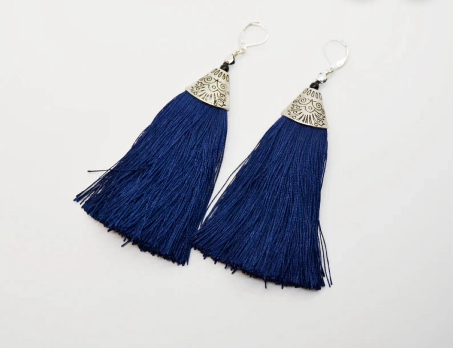 These are a pair of stylish tassel earrings in a beautiful navy blue colour. They feature silver-tone caps with intricate designs. Perfect for adding a pop of colour to any outfit!