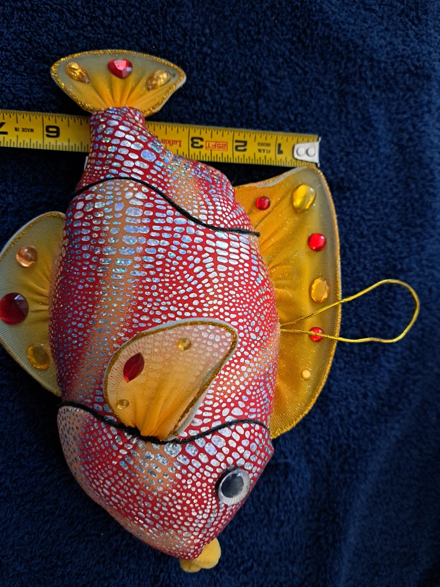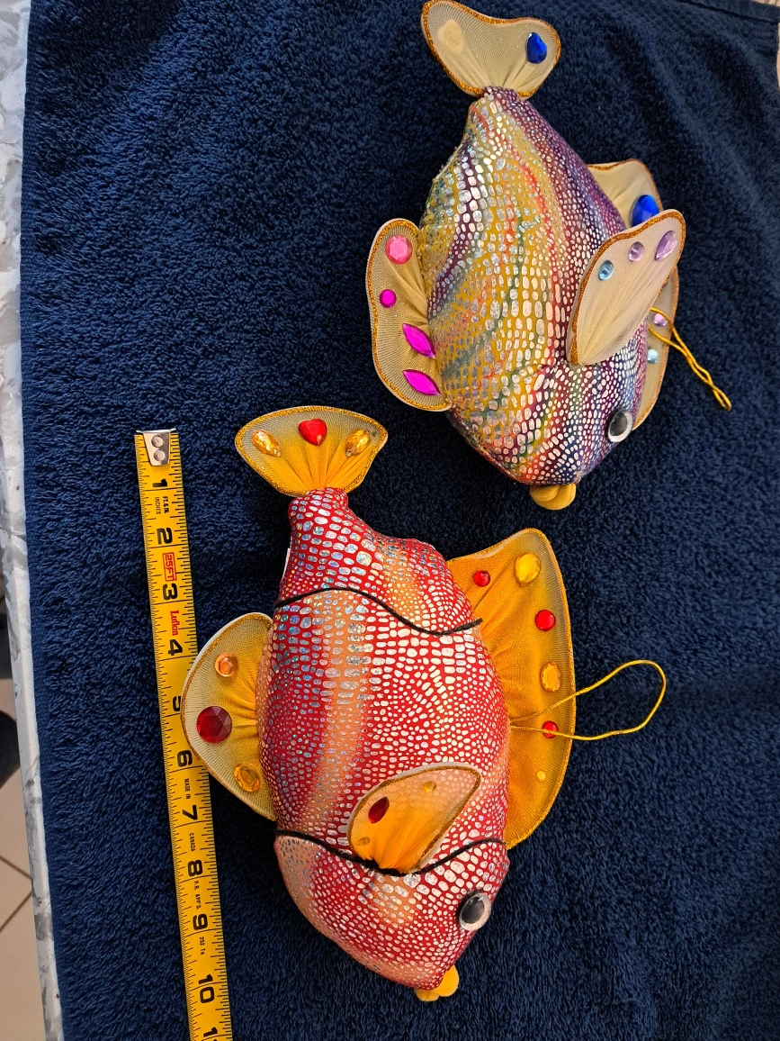 These colourful fish ornaments are sure to brighten up any space! They have a unique design with gem accents and are approximately 7 by 10 Inches