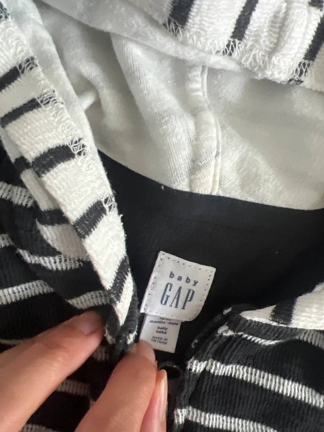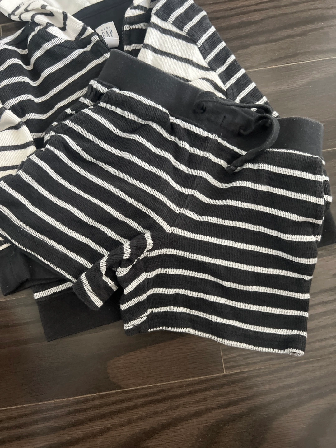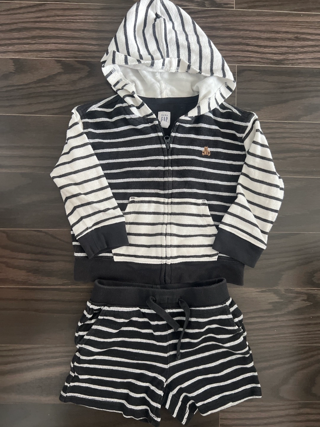 Super cute Baby Gap matching set! Includes a zip-up hoodie and shorts, both in a stylish black and white striped pattern. Perfect for your little one! Size 18-24m