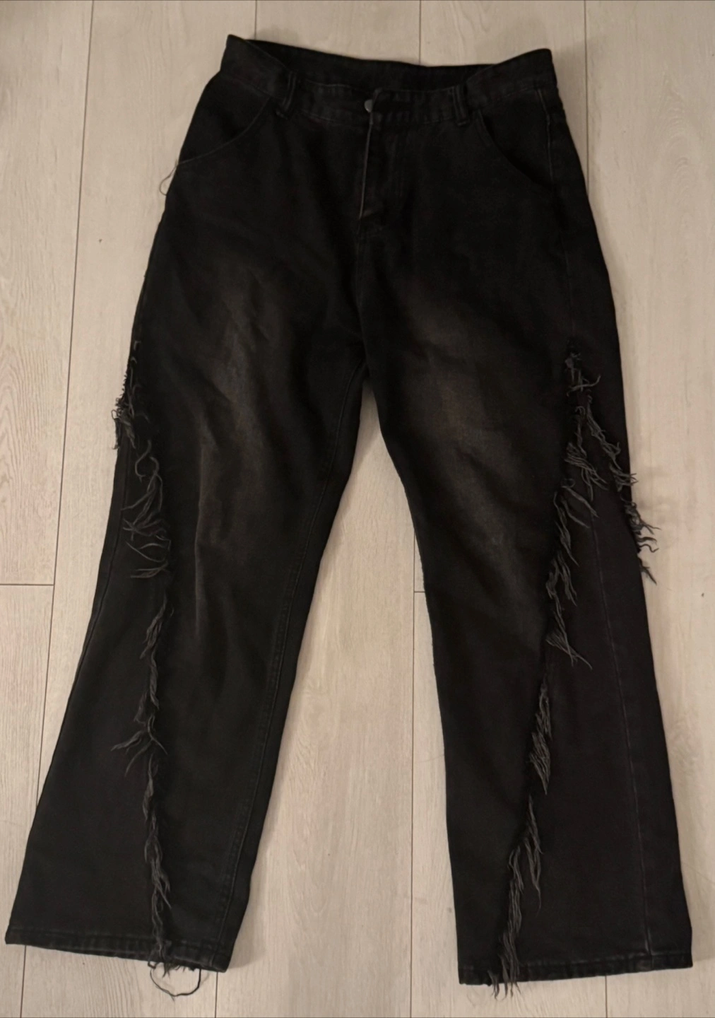 Black jeans with ruffles along side (size medium/4-6) Cute, comfy black jeans with covered ruffled rips along the legs. High rise, slight bootcut. Originally bought at a vintage store in Quebec! Good overall condition. Perfect for music festivals and summer. Price is firm, cash only please. Pickup at Jarvis & Dundas/Yonge & Dundas. Also able to meet elsewhere downtown and potentially at another station along line 1.