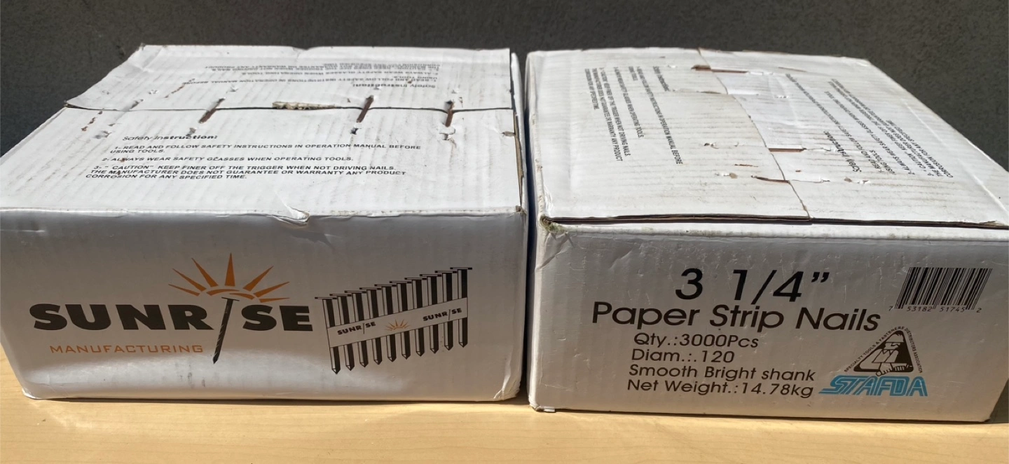 Selling a box of SUNR/SE 3 1/4" paper strip nails. The box contains 3000 pieces of smooth bright shank nails. Net weight is 14.78kg