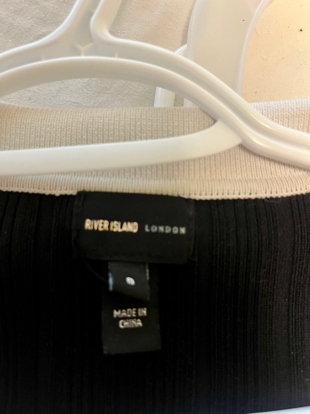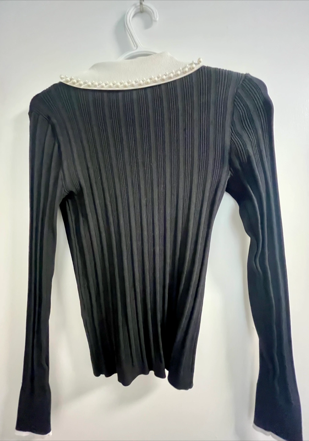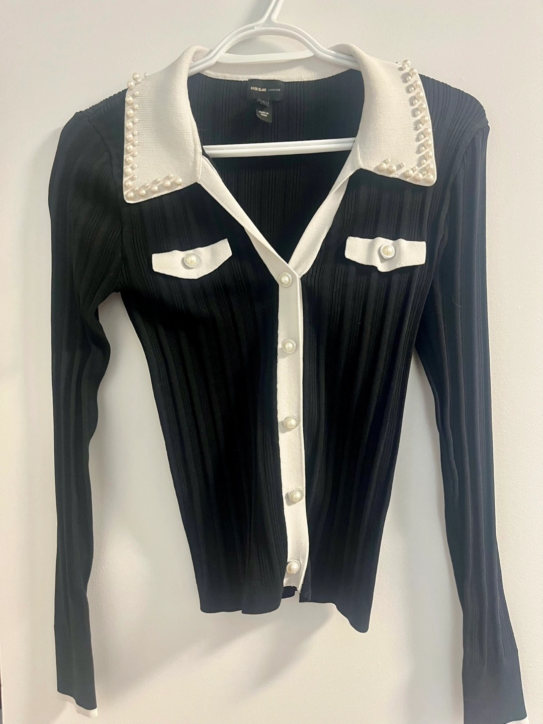 Selling a Vintage River Island London cardigan in black! It features a white collar with pearl embellishments and button-up closure. Size S. Pickup and cash only