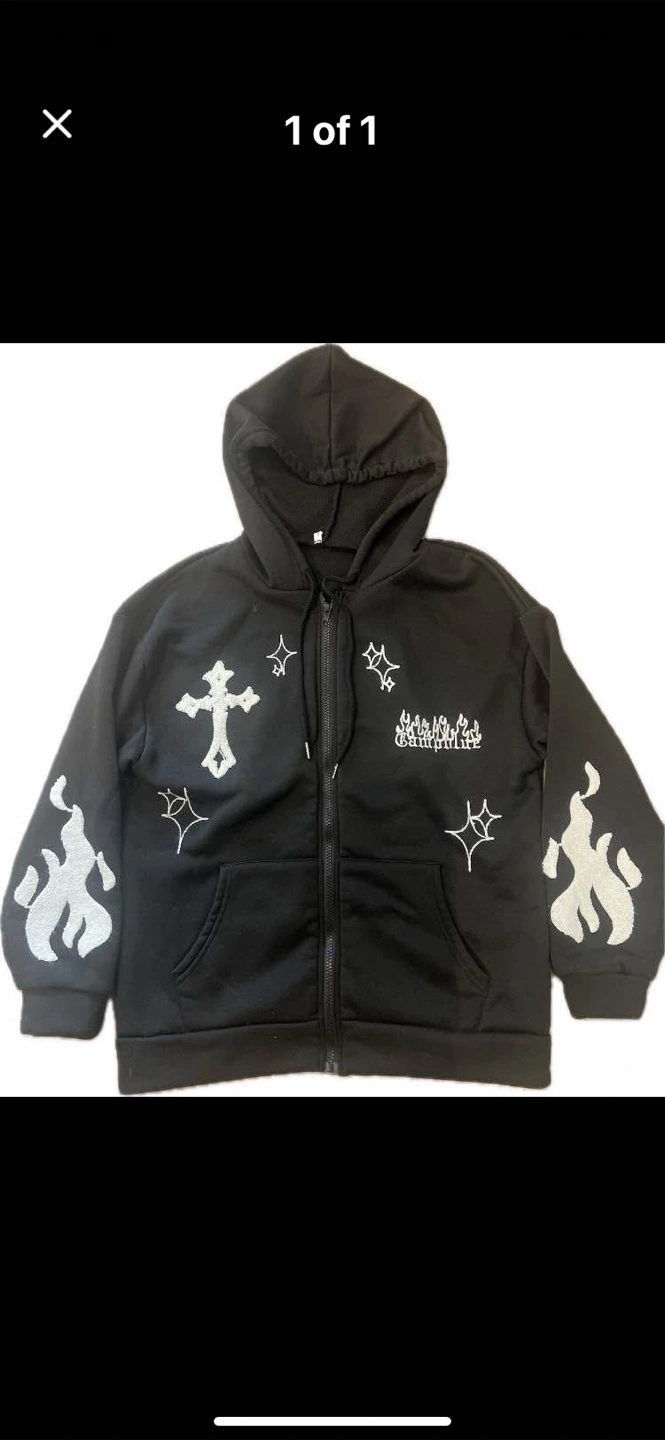 Selling a black zip-up hoodie with a unique design! It features a cross, stars, flames, and the words "Gangster Life" in a stylized font. It's in great condition and ready for a new home! Size large