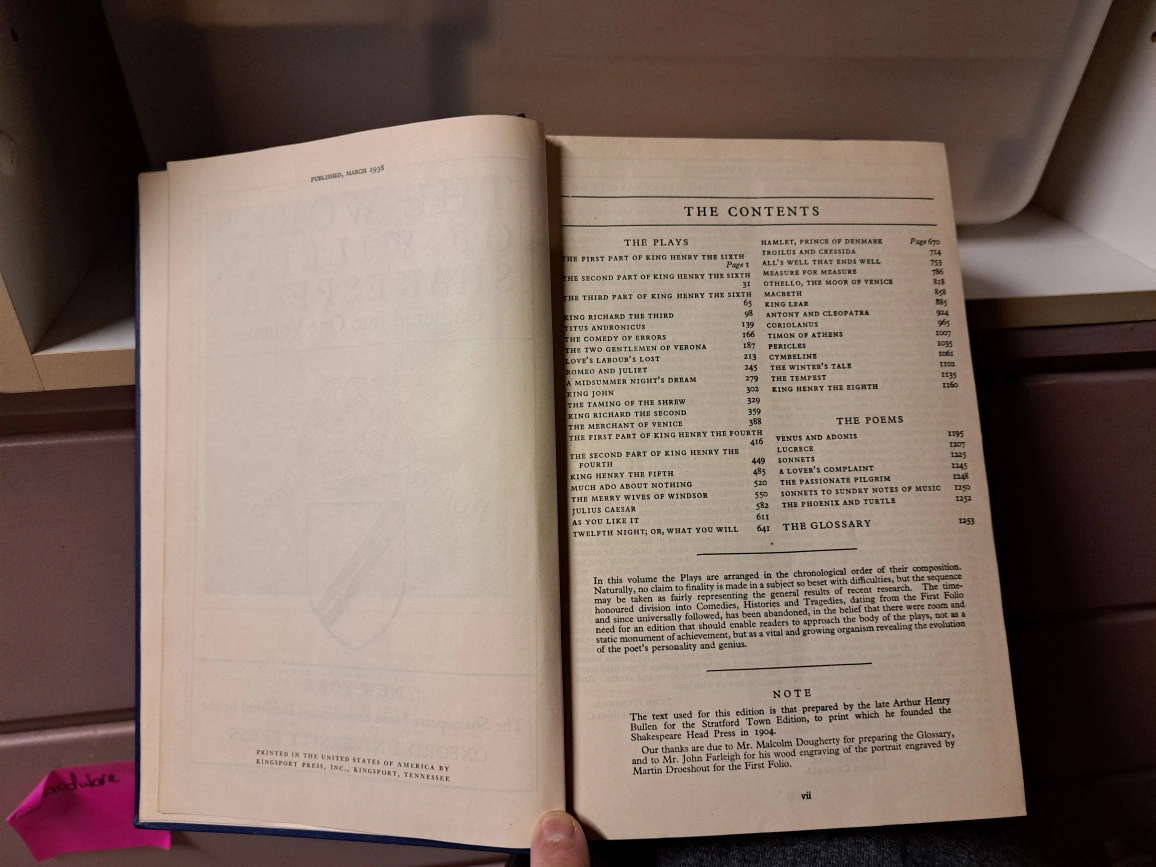 Selling a copy of The Complete Works of William Shakespeare. It's gathered into one volume and published by Oxford University Press in New York. This edition includes plays, poems, and the glossary. Published in 1938. Good Price compared to online offers.