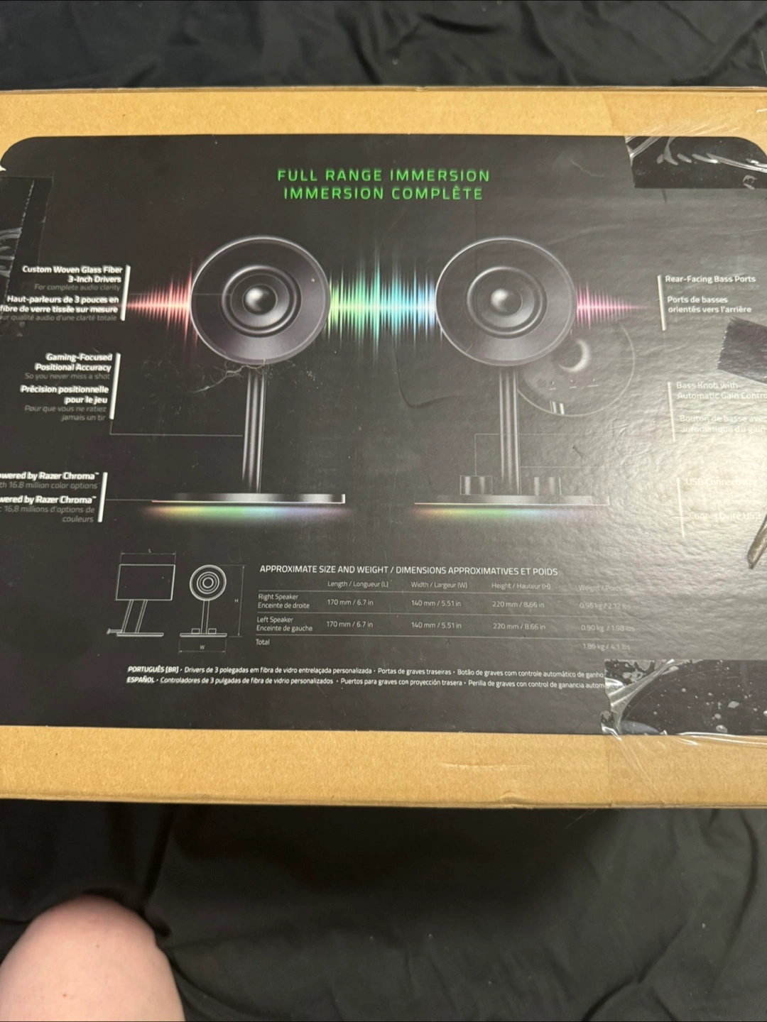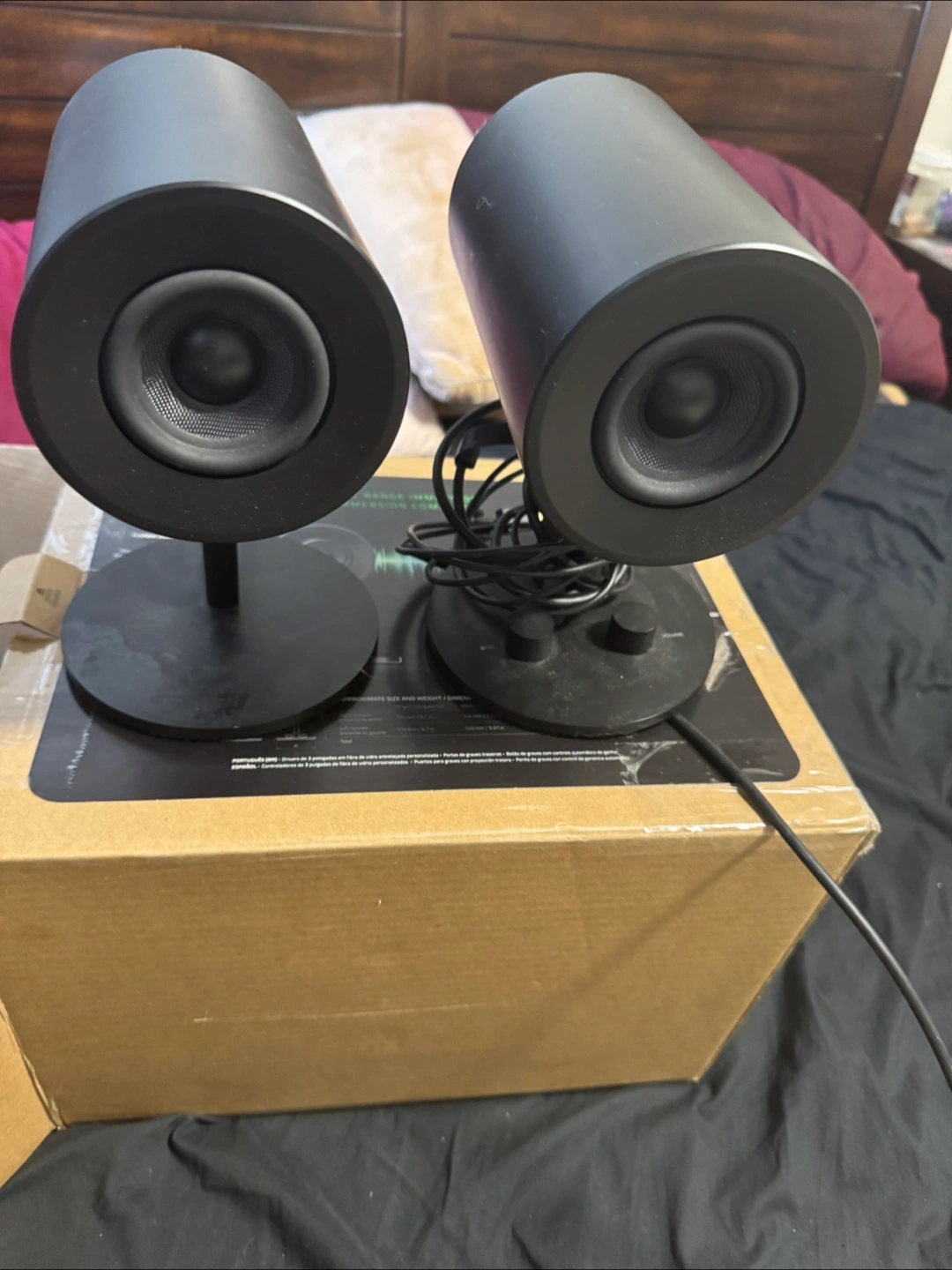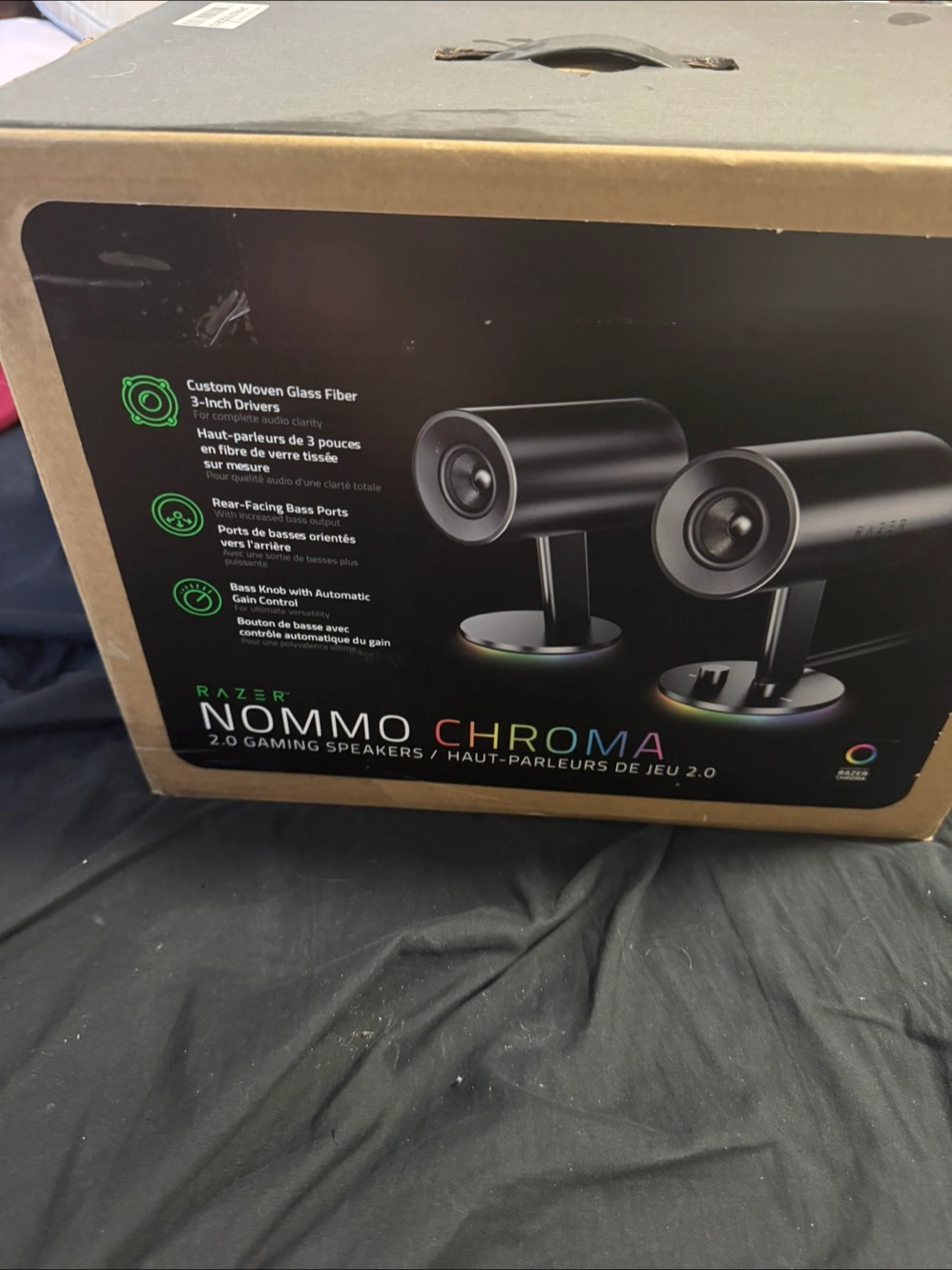 Selling a set of Razer Nommo Chroma 2.0 gaming speakers. They feature custom woven glass 3-inch drivers and rear-facing bass ports. The speakers also have a bass knob with automatic gain control. Box included!