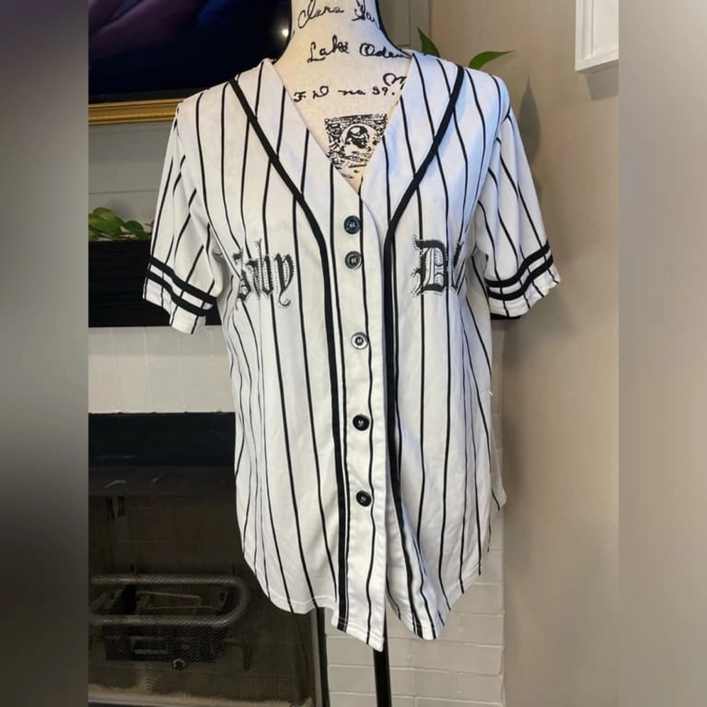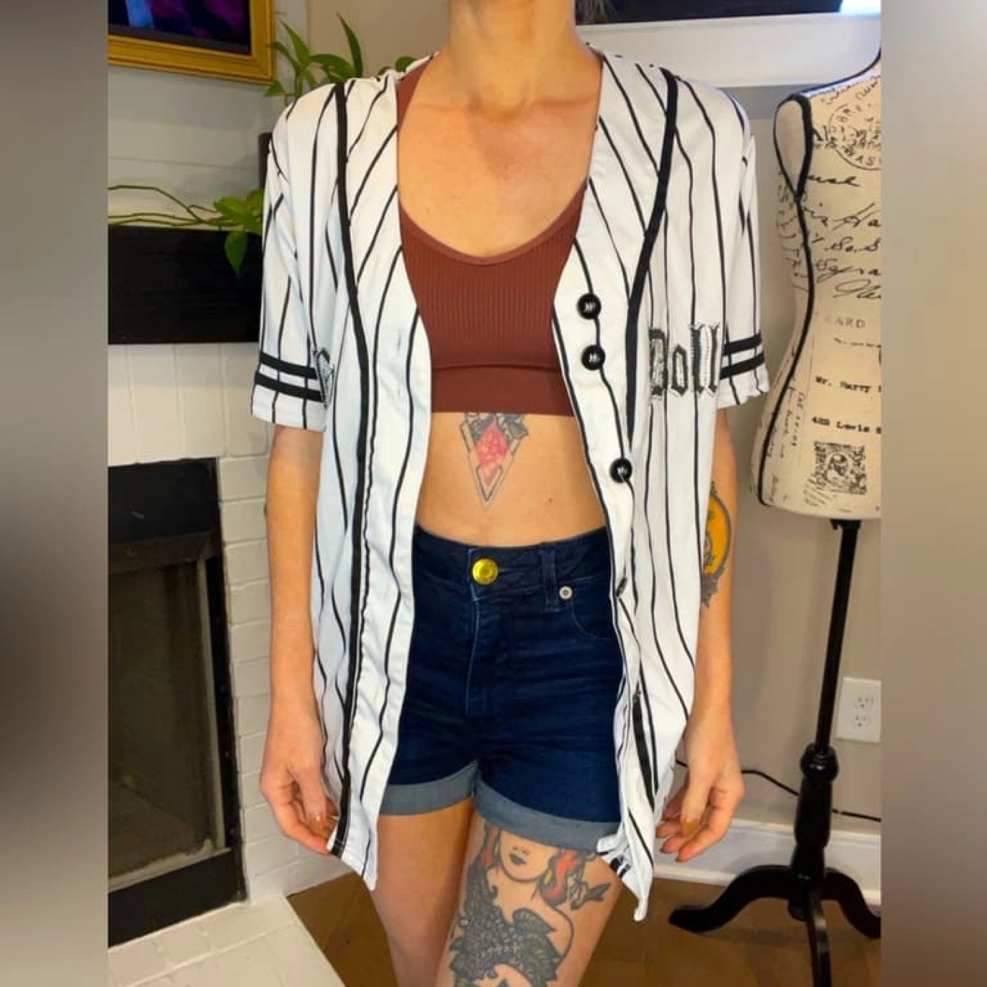 Classic baseball jersey with black and white stripes, perfect for a sporty look! The jersey features the words 'Baby Doll' on the front and the number '32' on the back. Meet at Sheppard, Bayview, or Bloor/Yonge station or some surrounding areas.