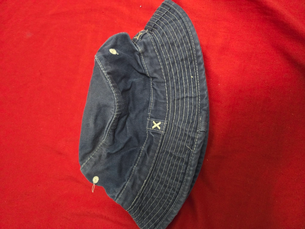 Here's a blue bucket hat that's in good condition! It's a stylish and practical accessory for sunny days