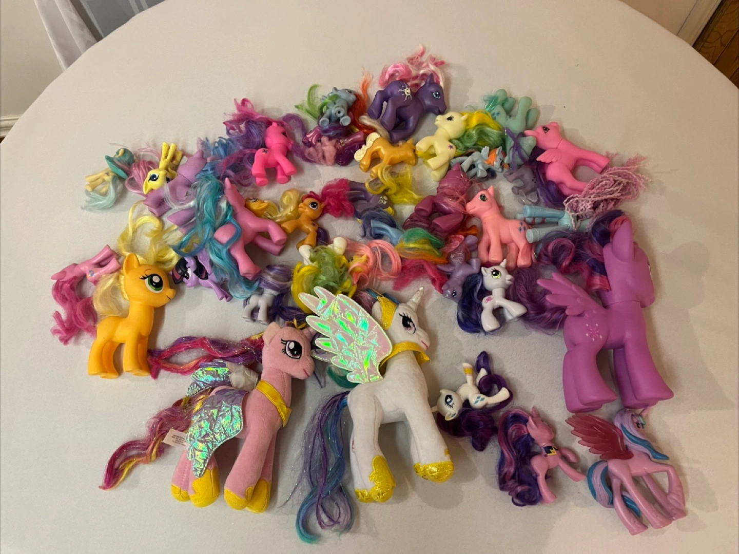 Various Vintage & Retro My Little Pony Figures 34 in total - There are detailed descriptions for some of them. Condition: Some are Excellent & Some are Good Used Condition 4 Different Sizes Most have brush-able hair Ask for more details or close up photos. Small Yellow Pony with Blonde Mane & Plastic Tail - G3 - “Butterscotch” - $10 Large Purple Pony with White & Pink Mane & Tail / Jewel on the Cutey Mark / “Star Dasher” - G3 / $15 Large Pink Pony with Blue & White Mane & Tail / Blue Jewel on the Cutey Mark / “Sapphire Shores” - G3 / $15 / 2004 “Friendship Ball” / Jewel Pony Series Small White Pony with Pink & Purple Mane & Tail - “Sweetie Belle - New Look” G 3.5 Cutie Mark: Heart with Swirls & Stars - $10 Small White Pony with Pink & Purple Mane & Tail - “Sweetie Belle - Friendship is Magic” G 4 Cutie Mark: None - $15 Small Purple Pony with Yellow Mane & Plastic Yellow Tail - Classic “Daisyjo” - G3 - 2005 - $10 Small Purple Pony with Pink Mane & Plastic Pink Tail / Stands on Back Legs - Cutie Mark: Stars & Swirls - “Starsong” - 2003 / $10 Small Yellow Pony with Pink Mane & Plastic Purple Tail /- 2009 / G3 - “Scoot a Loo” - / $10 Small Yellow Pony with Pink Mane & Tail & Yellow Wings/- 2016 / G4 - / “Fluttershy” - Cutie Mark - 3 Butterflies/ $15 Medium Mauve Pony with Plastic Blue & Purple Tale & Mane & - Cutie Mark: Sun - Pink Wings / “Princess Celestia - Pegasus Wings” - 2010 / $15 Small Mauve Pink Pony with Pink & Purple Mane & Tail /- 2010 / G4 - “Twilight Sparkle” - Pirate Pony / Cutie Mark: Twilight Sparkle- / $15 Large Mauve Pink Pony with Pink & Purple Mane & Tail /- 2015 / G4 - “Twilight Sparkle” - / Cutie Mark: Twilight Sparkle- / $15 Small Mauve Purple Pony with Pink & Purple Plastic Mane & Tail /- 2018 / G4 - “Twilight Sparkle” - / Cutie Mark: Twilight Sparkle- / Pull tail to make the Wings Flap - $15 Small White Pony with Purple & Pink Mane & Tail / G4 - “Rarity” - / $15 - Pirate Movie Pony Small Blue Pony with Rainbow Mane & Blue Tail - “Rainbow Dash” - Classic Figure - Friendship Is Magic - $15 Small Pink Pony with Pink Mane & Tail - “Pinkie Pie” with Balloons on the Cutie Mark - 3” - G4 - 2010 - Canterlot Castle - $15 Small Pink Pony with Pink & Purple Mane & Tail - “Cheerilee”with Flowers on the Cutie Mark - 3” - $10 Small Cream/ Yellow Pony with Green Plastic Hair Do Mans and Blue Tail - “Coco Pommel” - 2016 / $15 Small Orange/ Yellow Pony with Yellow Mane & Tail - “Apple Jack” - FIM - 2016 - Potion Pony Small Blue/ Cutie Mark - 3 Apples - $15 Large Orange/ Yellow Pony with Yellow Mane & Tail - “Apple Jack” - FIM - 2016 - Potion Pony Small Blue/ Cutie Mark - 3 Apples - $15 Small Light Blue Pony with a Plastic Mane & a Multi Coloured Tail / Wings / “Rainbow Dash” 3” - $10 Large Pink Beanie Baby Pony - Pegasus - 9” - “Sparkle” - “Princess Cadence” - Multicolour Tinsel Mane & Tail - Purple Pearly Wings - $15 Large White Beanie Baby Pony - Pegasus - 9” - “Sparkle” - “Princess Celestia” - Multicolour Rainbow Tinsel Mane & Tail - Pearly Wings - $15 Make an offer for multiples. No Smokers, No Pets No Stains, No Flaws Midtown Toronto Location
