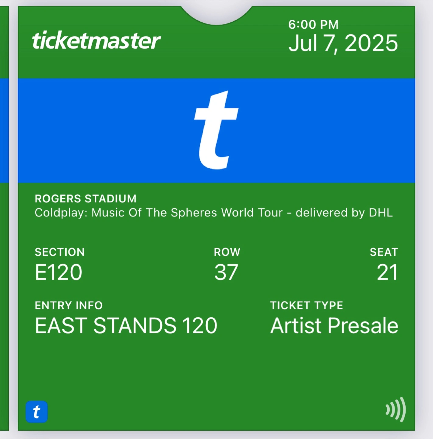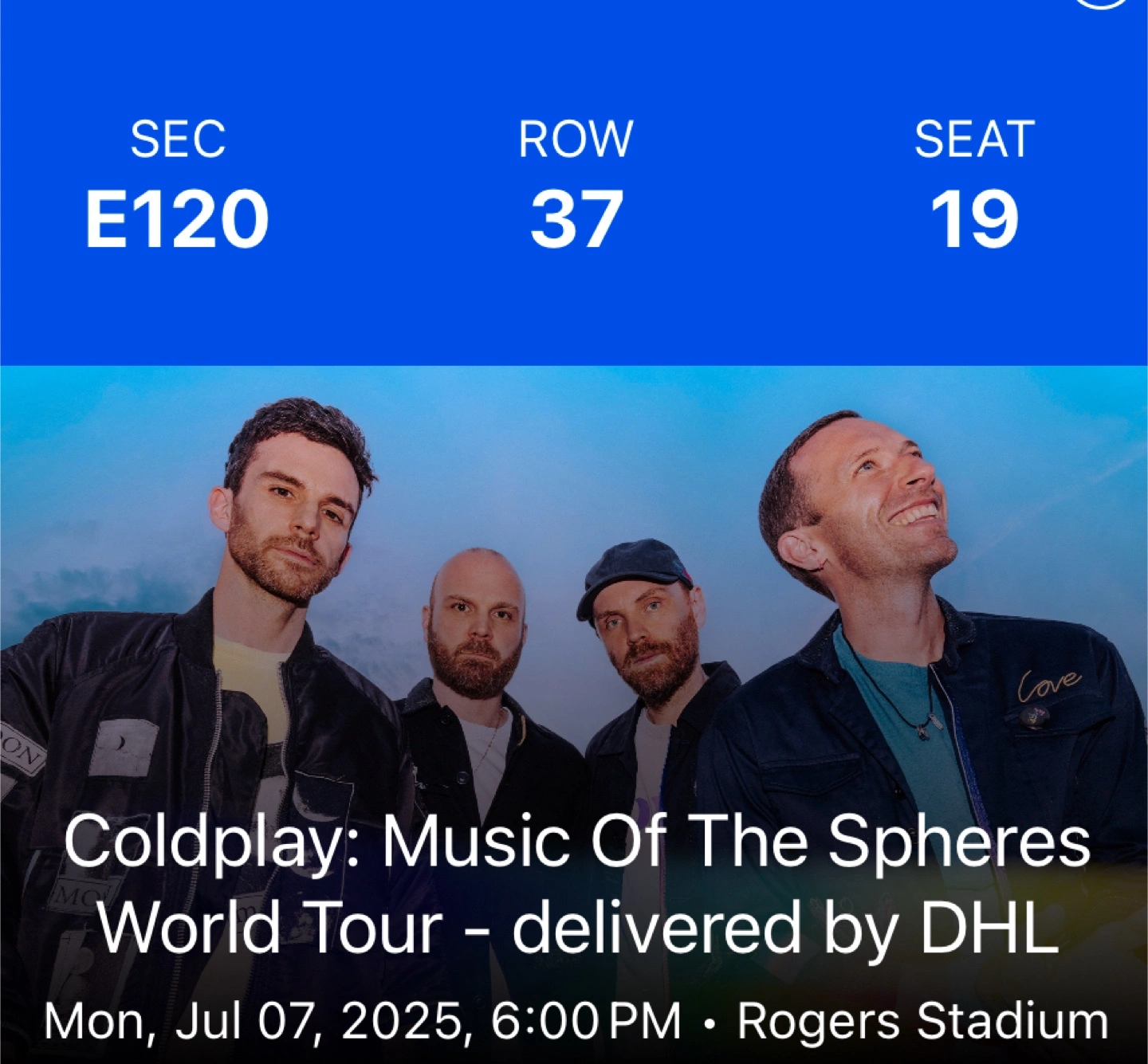 Selling tickets to see Coldplay at Rogers Stadium on Monday, July 7, 2025, at 6:00 PM. The seat is located in section E120, row 37, seats 19-22. Don't miss out on the Music Of The Spheres World Tour! Price is $500 per ticket. Sold by pairs only. Transfer in person, cash or etransfer only. Update: SEATS 19-20 SOLD. SEATS 21-22 Still available.