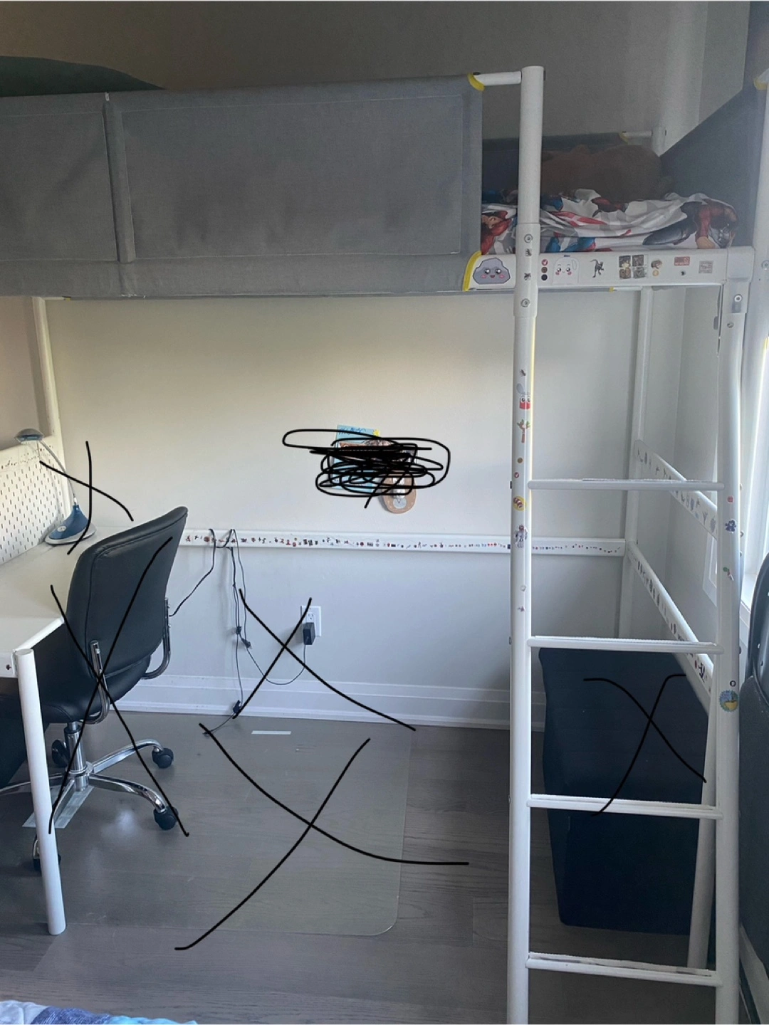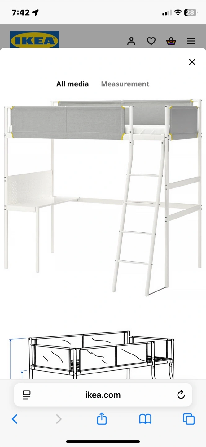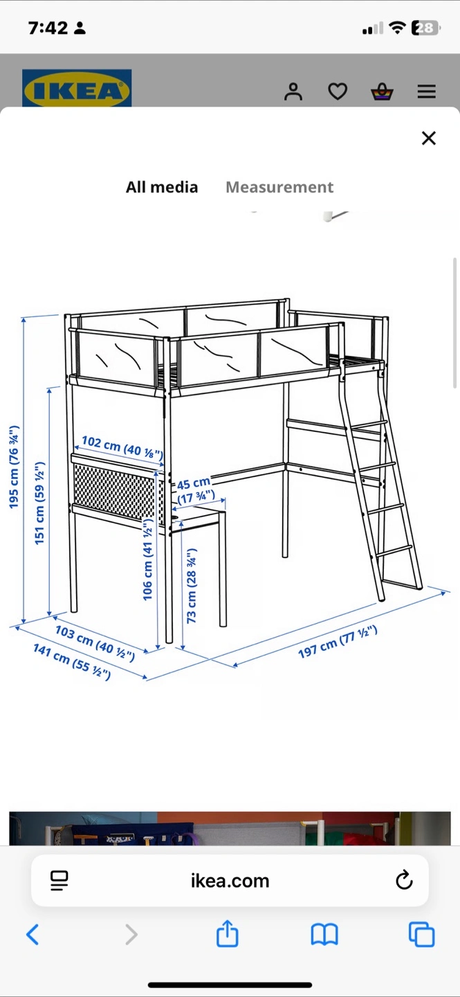 Selling an IKEA loft bed frame with a built-in desk. It's in great shape and perfect for saving space in a smaller room. The dimensions are approximately 195 cm (76 3/4") in height, 141 cm (55 1/2") in width, and 197 cm (77 1/2") in length